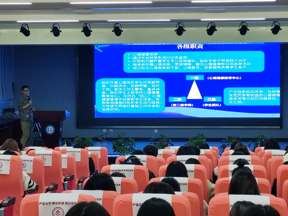 3月26日、28日晚,心理健康教育中心教师在临床护理学院等3个学院开展了“心理危机预警与干预方案” 6场学术讲座。2022级、2023级辅导员、班主任,朋辈心理辅导员、心理委员及共900余名学生代表参加。