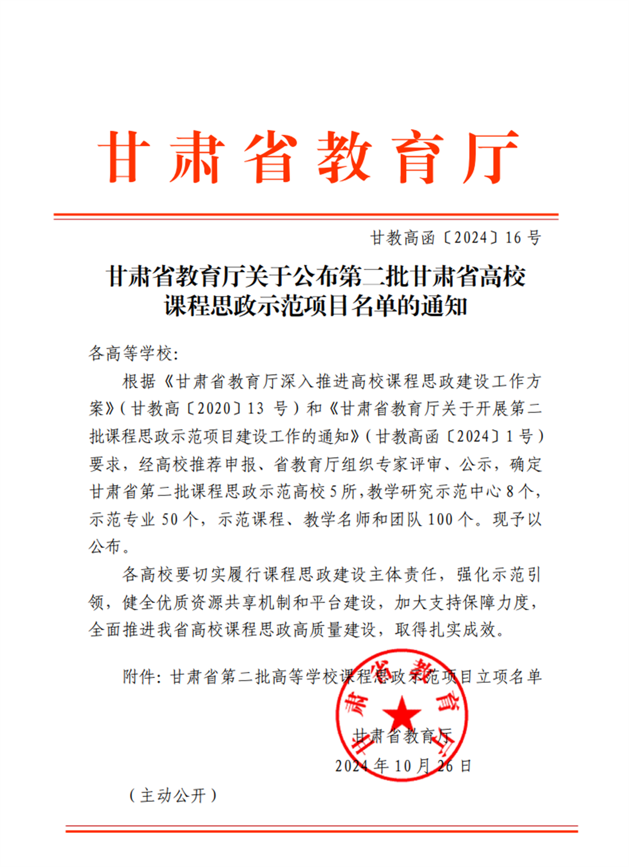 近日,甘肃省教育厅印发《关于公布第二批甘肃省高校课程思政示范项目名单的通知》(甘教高函〔2024〕16 号),我校推荐申报的药学和助产2个专业均获批甘肃省课程思政示范专业,由达朝锦老师领衔的《基础护理学》和徐明丽老师领衔的《护理药理学》2门课程及其教学团队分别获批甘肃省课程思政示范课程、教学名师和团队。