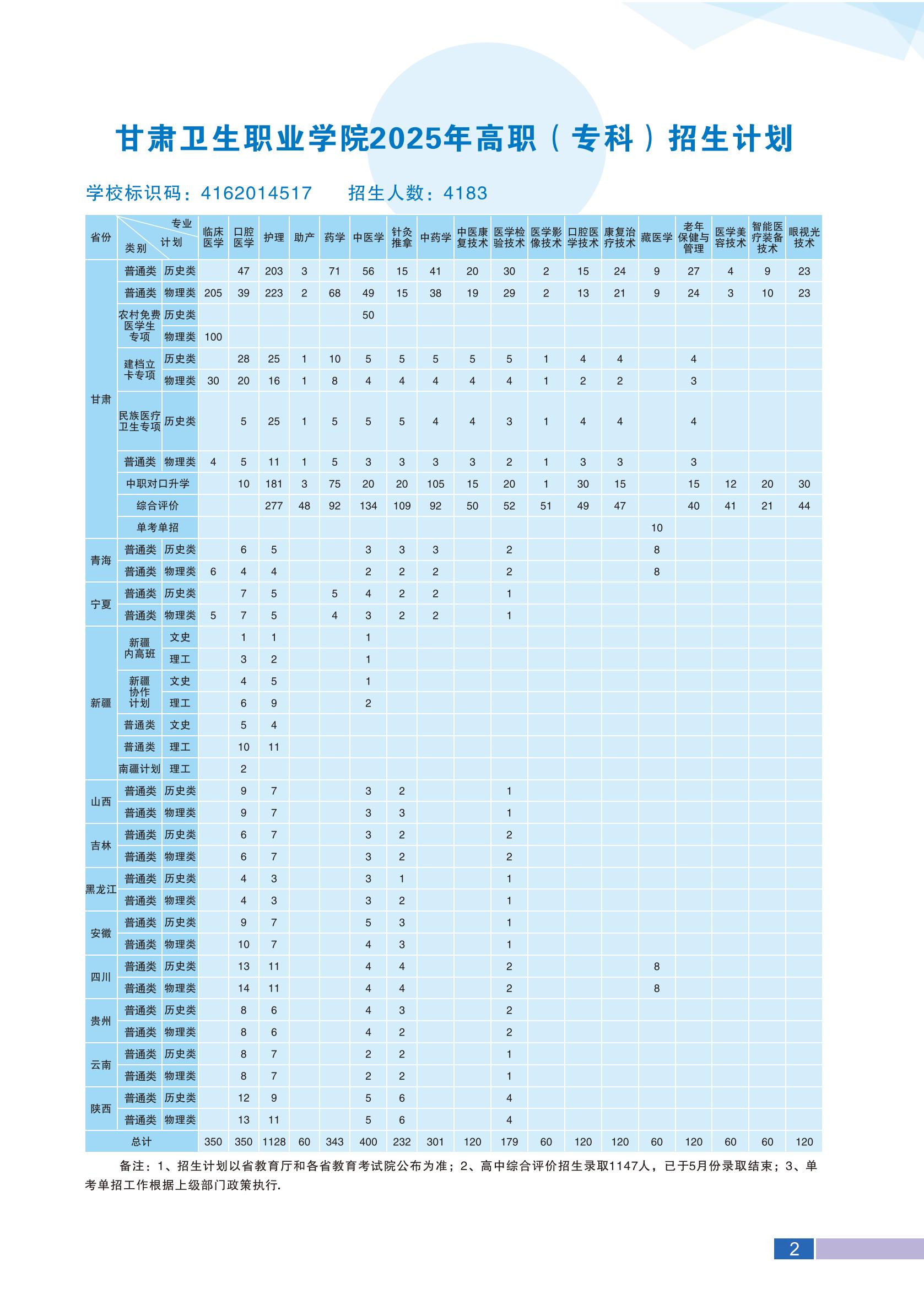 甘肃卫生职业学院2025年高职(专科)招生计划