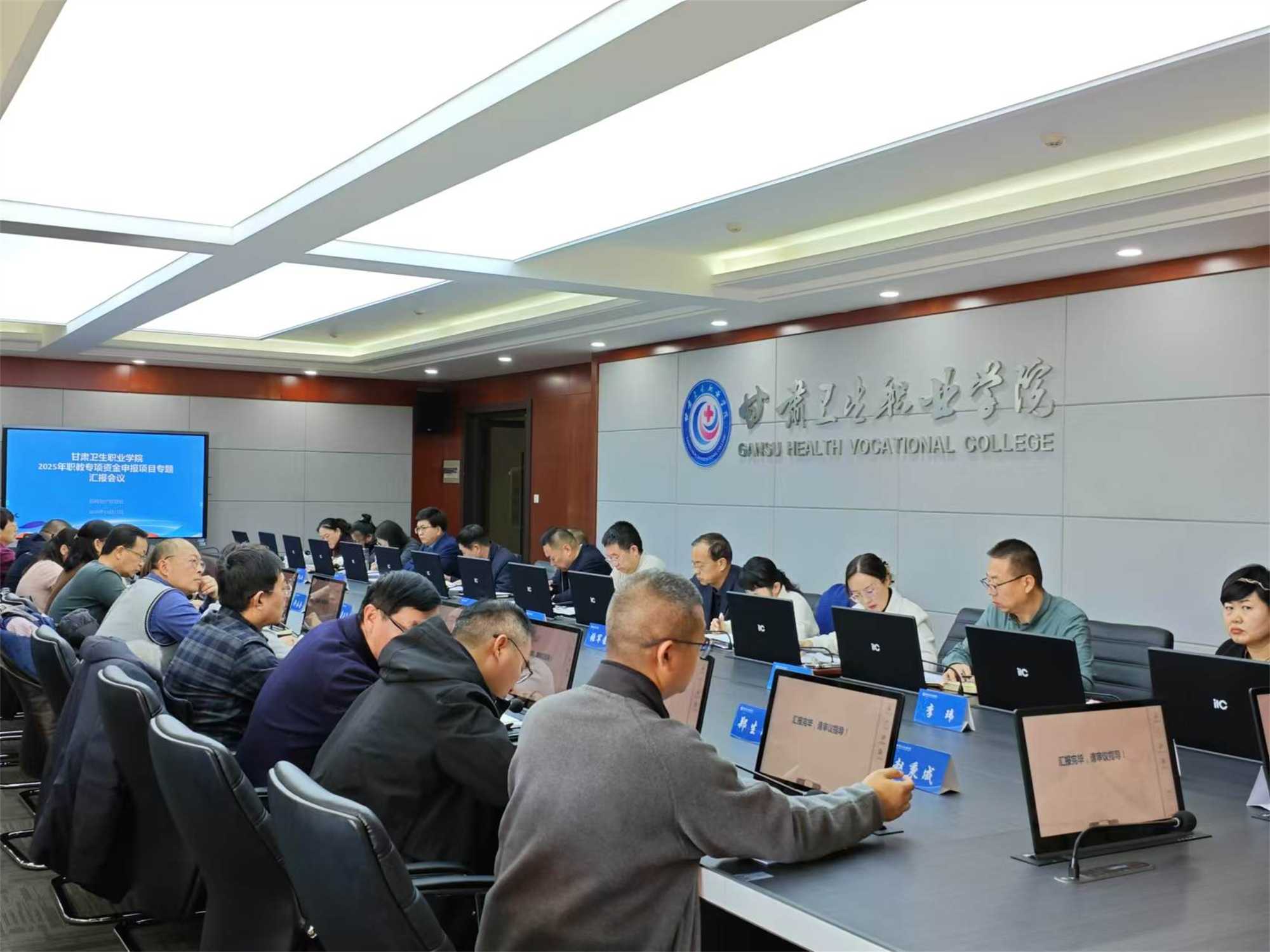 2024年11月27日下午在甘肃卫生职业学院行政办公楼3楼无纸化会议室召开2025年职教专项资金申报项目专题汇报会议,学校党委书记包磊、校长王建成、党委副书记毕效武、纪委书记刘斌、副校长高博、张军荣、邱文云、杨频出席会议,学校各部门(处室)和二级学院项目负责人参会,会议由杨频副校长主持。