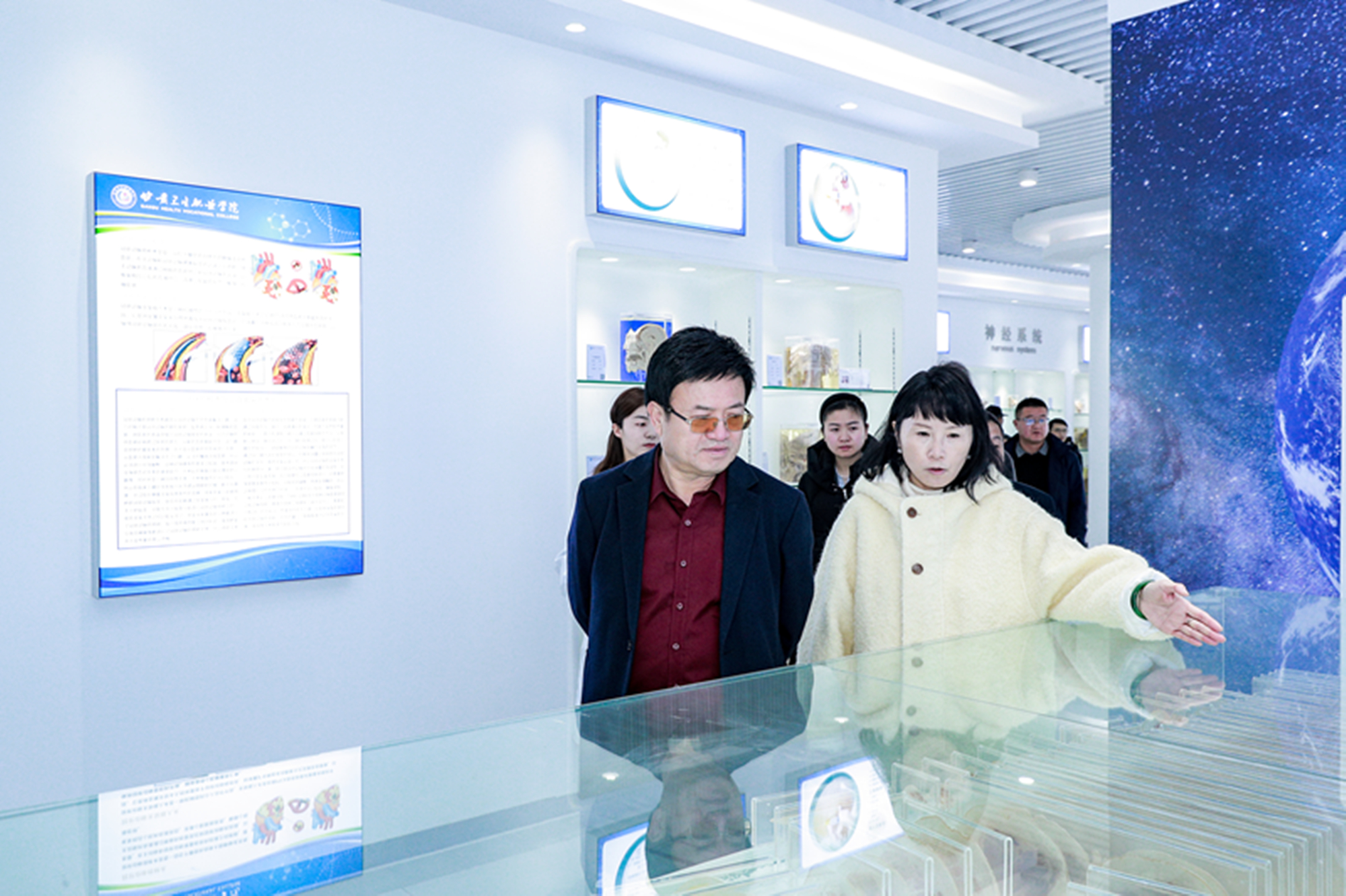 交流活动分两组开展,副校长高博带队参观了学校心理健康教育中心、就业创新实训中心、马克思主义学院红色教育基地、怀仁馆职工之家及学校食堂;副校长张军荣带队参观了中医学院、药学院、护理学院、口腔医学院、医学技术与工程学院实训中心及基础医学院生命科学馆。