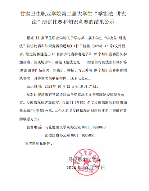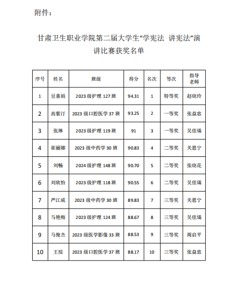 甘肃卫生职业学院第二届大学生“学宪法 讲宪法”演讲比赛和知识竞赛的结果公示