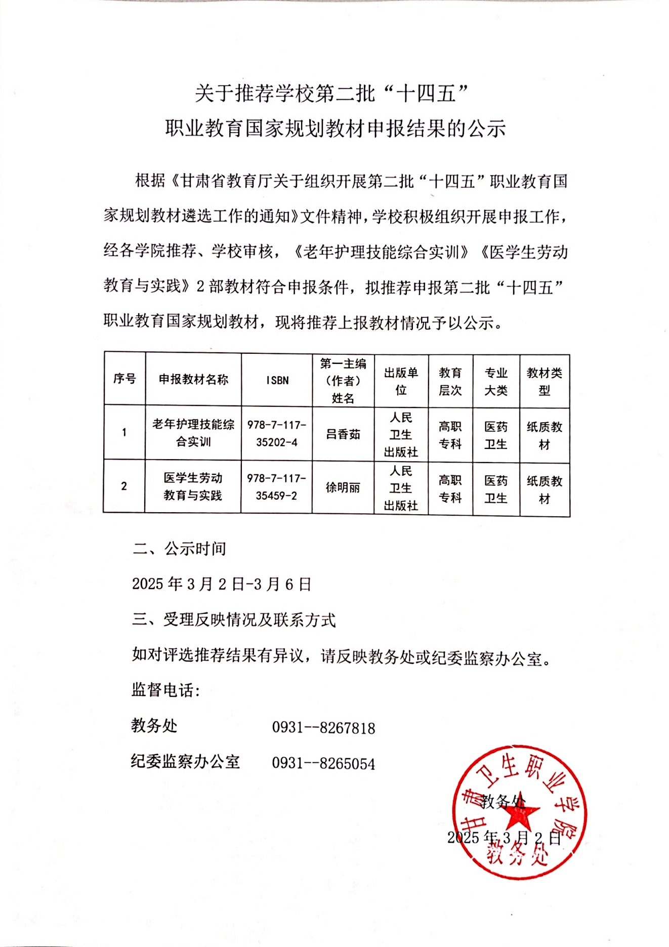 关于推荐学校第二批“十四五”职业教育国家规划教材申报结果的公示