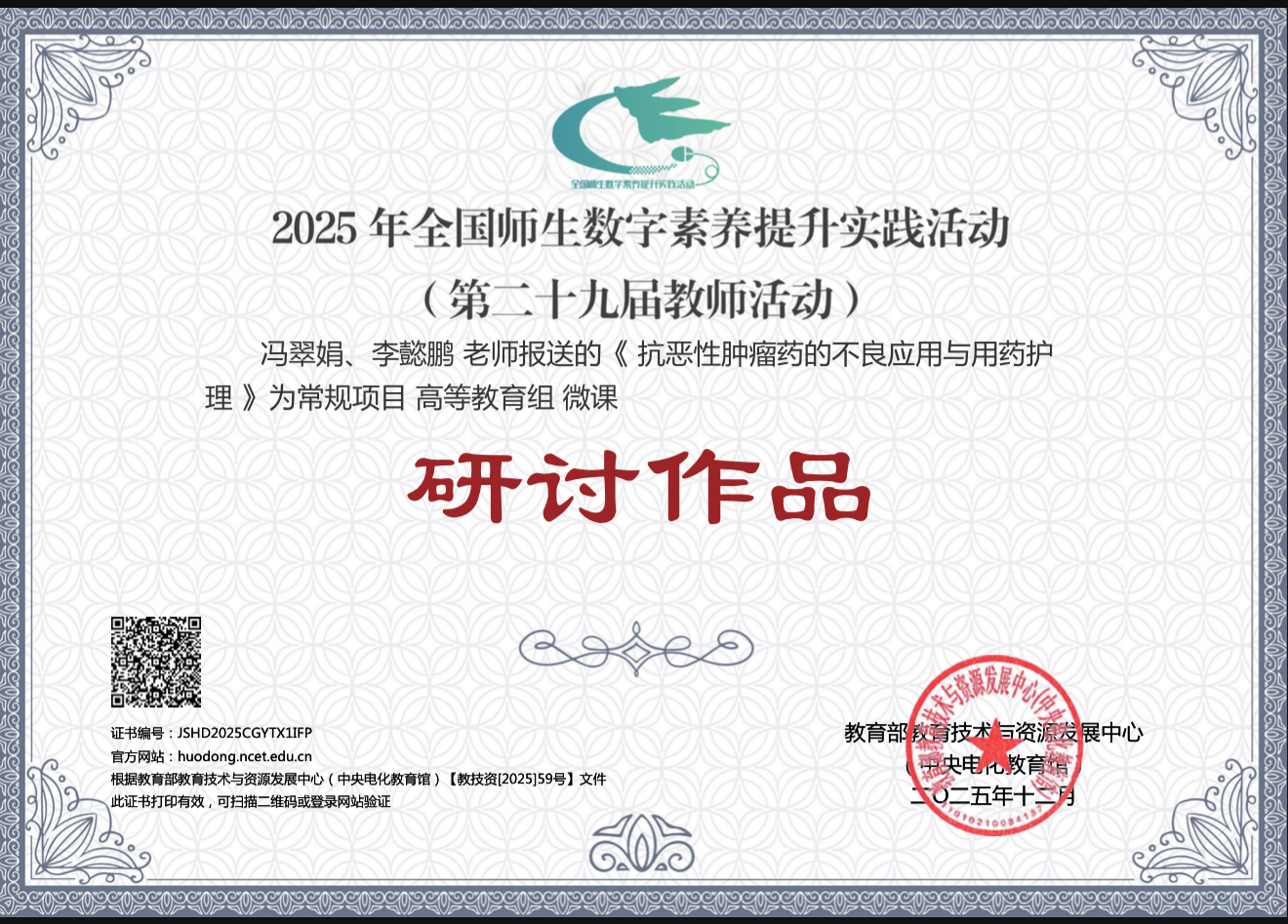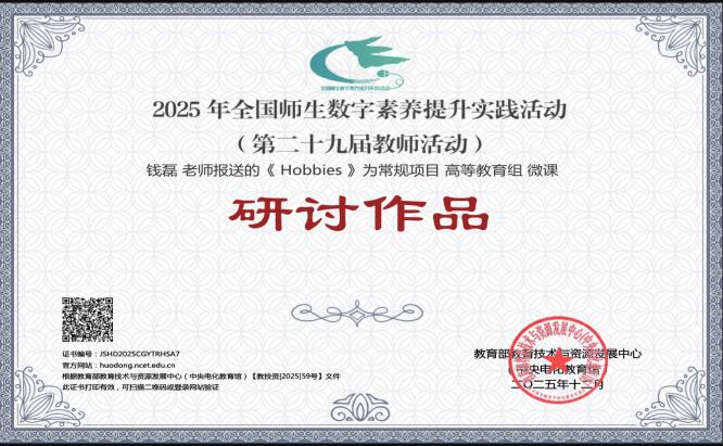 近日,全国师生数字素养提升实践活动(第二十九届教师活动)作品评选结果正式揭晓,我校推荐的钱磊《Hobbies》、张杰《Cart Intelligence》、冯翠娟《抗恶性肿瘤药的不良反应与用药护理课程思政微课视频》3部微课作品,成功入选常规项目高等教育组研讨作品。