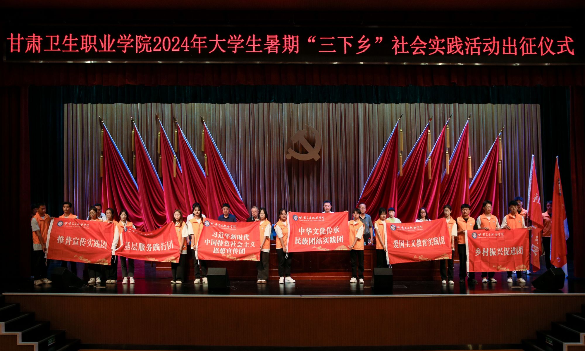 在随后举行的授旗仪式上,包磊书记、王建成校长为暑期“三下乡”社会实践活动志愿者代表授校旗和队旗,其余校领导向各志愿者分队代表授分队旗。最后,包磊宣布,甘肃卫生职业学院2024年大学生志愿者暑期文化科技卫生“三下乡”社会实践活动全体志愿者正式出征。