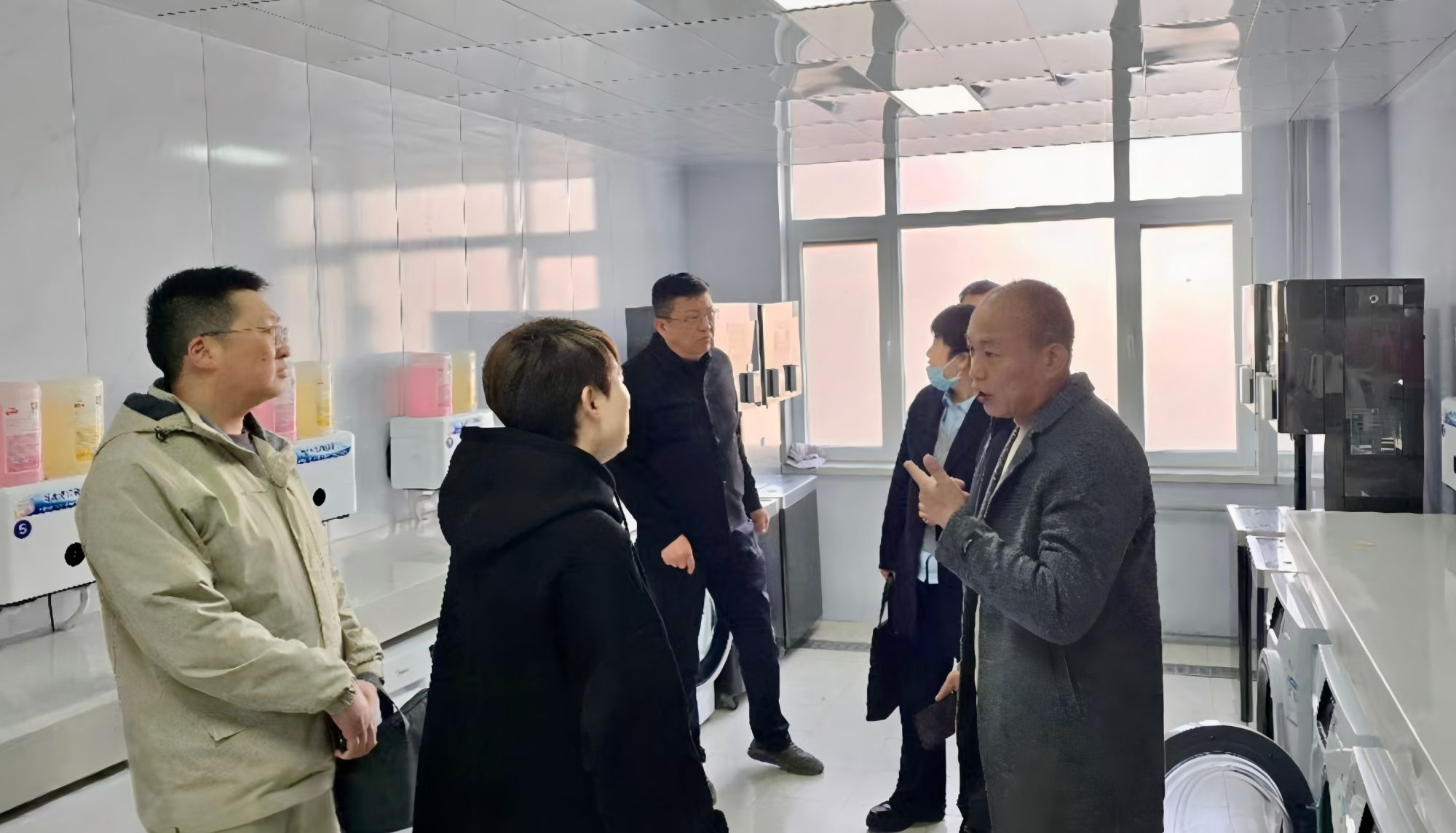 李燕一行实地考察了学校学生社区智慧淋浴间和洗衣房,详细了解热水供应系统的节能设计、分时段预约功能及故障自动报修等流程。随后在学校勤笃楼415会议室进行了座谈,就“一站式”学生社区的建设理念与创新实践进行深入交流。