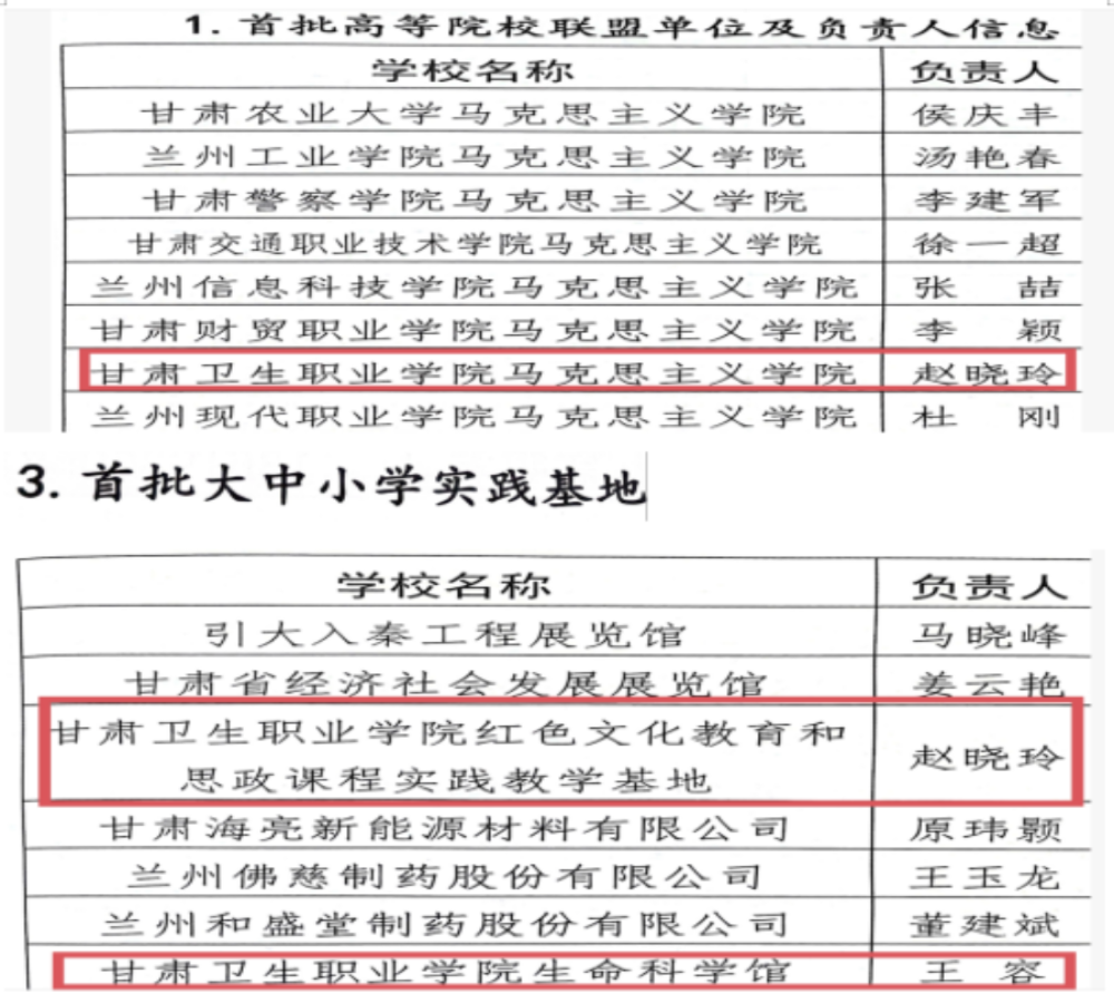近日,兰州新区教育和卫生健康委员会(疾病和预防控制局)印发文件,公布兰州新区大中小学思政课一体化共同体首批联盟单位和首批大中小学思想政治教育实践基地名单,学校马克思主义学院入选高等院校联盟单位,红色文化教育暨思政课程实践教学基地和生命科学馆获评“兰州新区大中小学思想政治教育实践基地”。