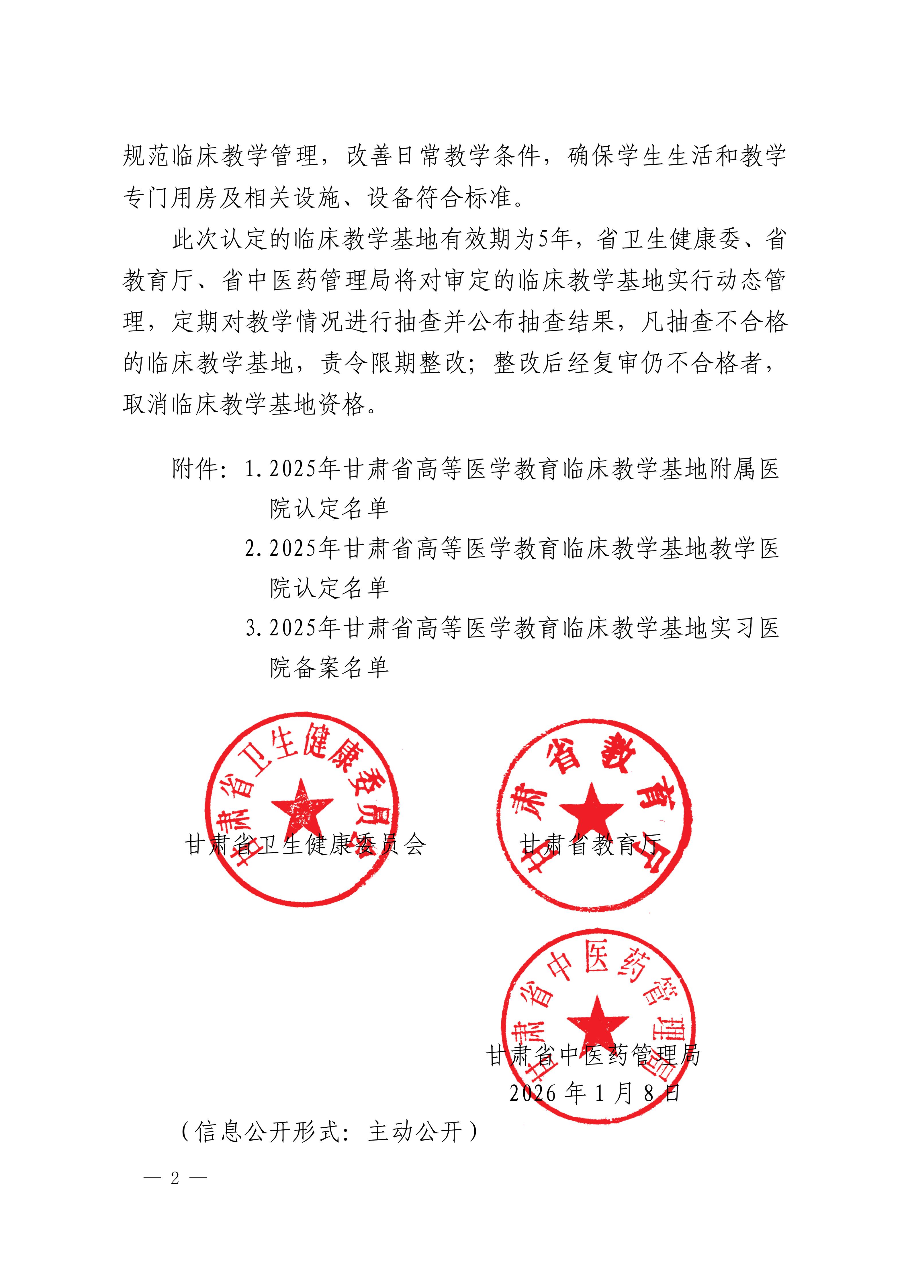 近日,甘肃省卫生健康委员会、甘肃省教育厅、甘肃省中医药管理局联合印发《关于公布2025年临床教学基地认定及备案名单的通知》(甘卫教科函〔2026〕1号),正式公布全省相关高校附属医院、教学医院及实习医院名单。其中,甘肃卫生职业学院申报的14家教学医院与42家实习医院顺利通过评审,获得正式认定。