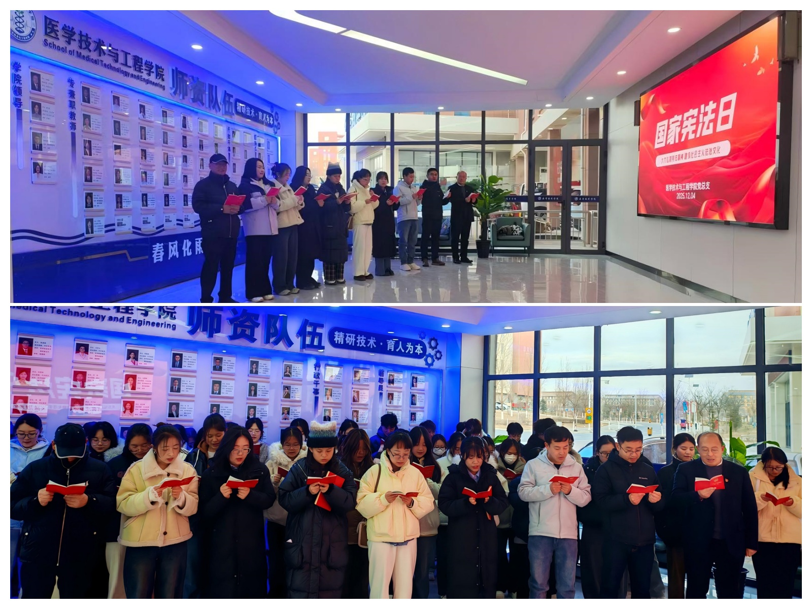在第十二个国家宪法日来临之际,为深入学习贯彻习近平法治思想,扎实推进宪法宣传教育,12月4日上午,医学技术与工程学院教师党支部联合学生党支部在扁鹊楼一楼大厅组织开展“宪法晨读”主题党日活动。学院全体党员及学生代表参加活动。