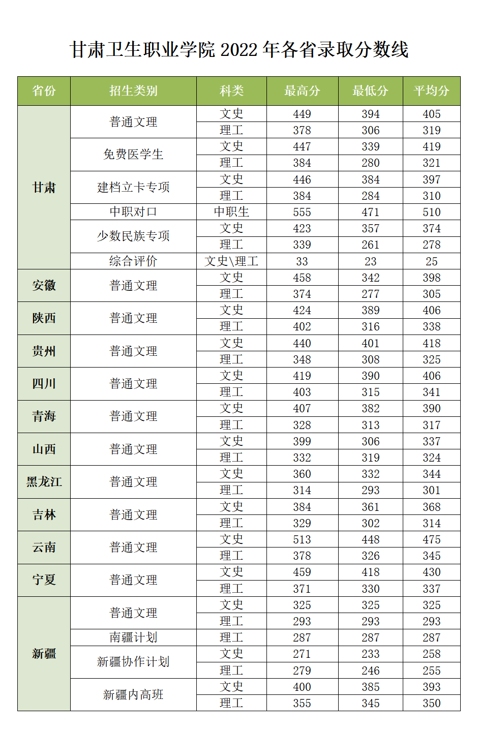 甘肃卫生职业学院2022年各省录取分数线发布时间:2023-06-12 -