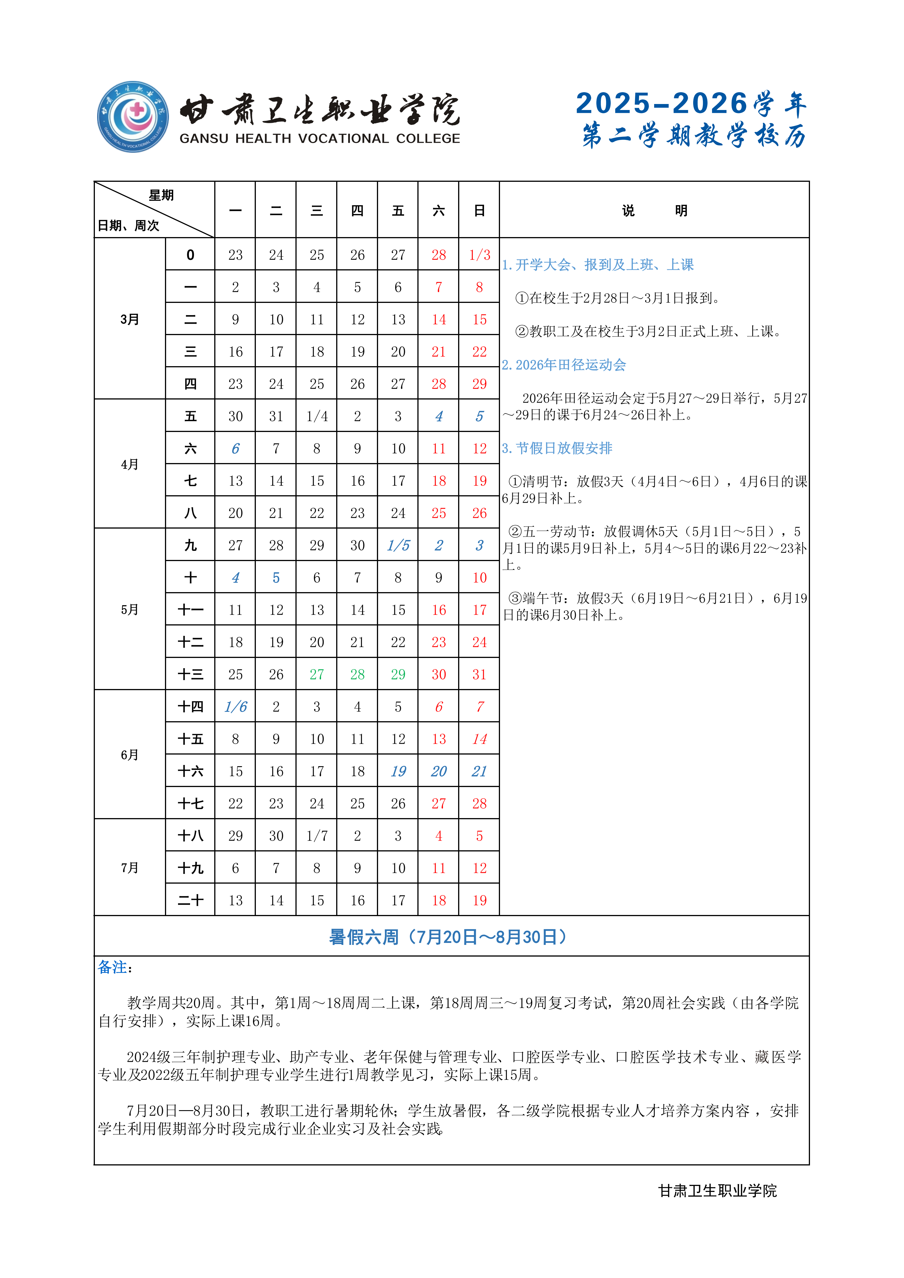 甘肃卫生职业学院2025-2026学年第二学期教学校历发布时间:2026-03-03