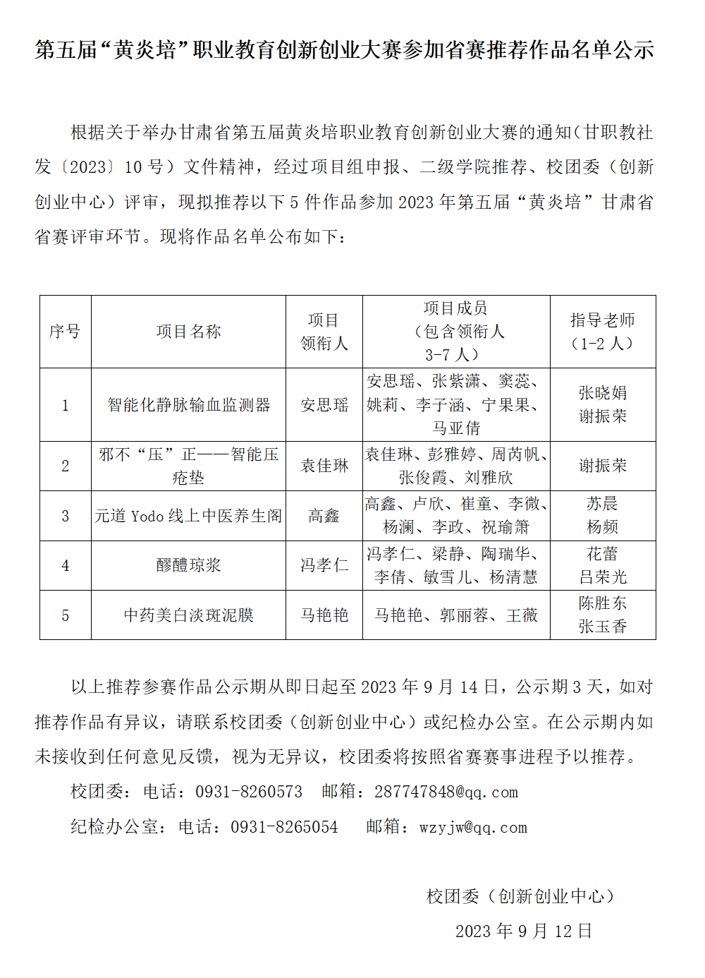 第五届“黄炎培”职业教育创新创业大赛参加省赛推荐作品名单公示发布时间:2023-09-12