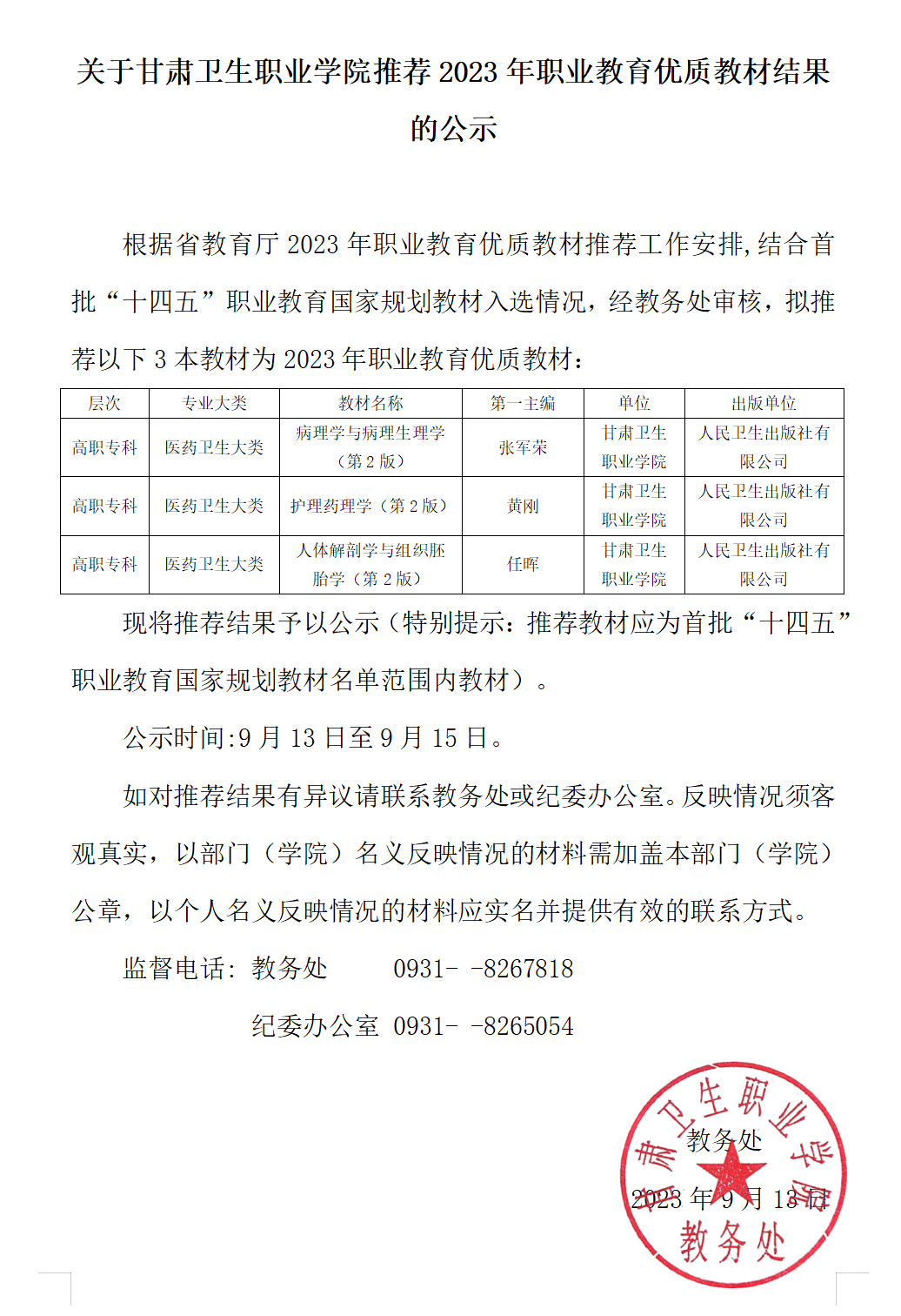 关于甘肃卫生职业学院推荐2023年职业教育优质教材结果的公示发布时间:2023-09-12 -