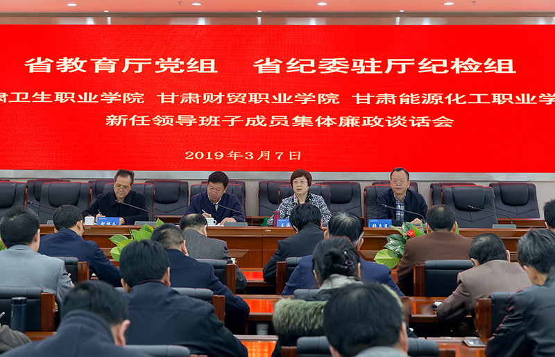 省教育厅党组、省纪委驻厅纪检组对甘肃卫生职业学院、甘肃财贸职业学院、甘肃能源化工职业学院新任领导班子成员进行集体廉政谈话发布时间:2019-03-08 -