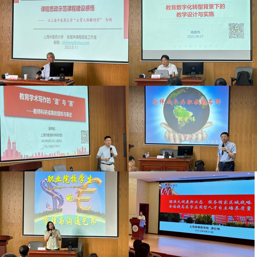 此次培训包含两部分内容,一是理论培训,多位知名教授、专家带领教师们深入学习了“双高”和扩招背景下的专业群建设、专业课程融入思政教育工作的教学设计理念与方法、教育数字化转型背景下的教学设计与实施、高职(卫生职业)院校升格为应用型本科后的机遇与挑战、双师型教师素质与培育、临床学科建设与创新教学团队建设、职业院校学生的管理与沟通艺术、医学教育发展趋势和卓越医学人才培养探索等内容,参训教师进一步了解了先进的教科研理念和方法,同时也积极反思了自己的教育教学工作。
