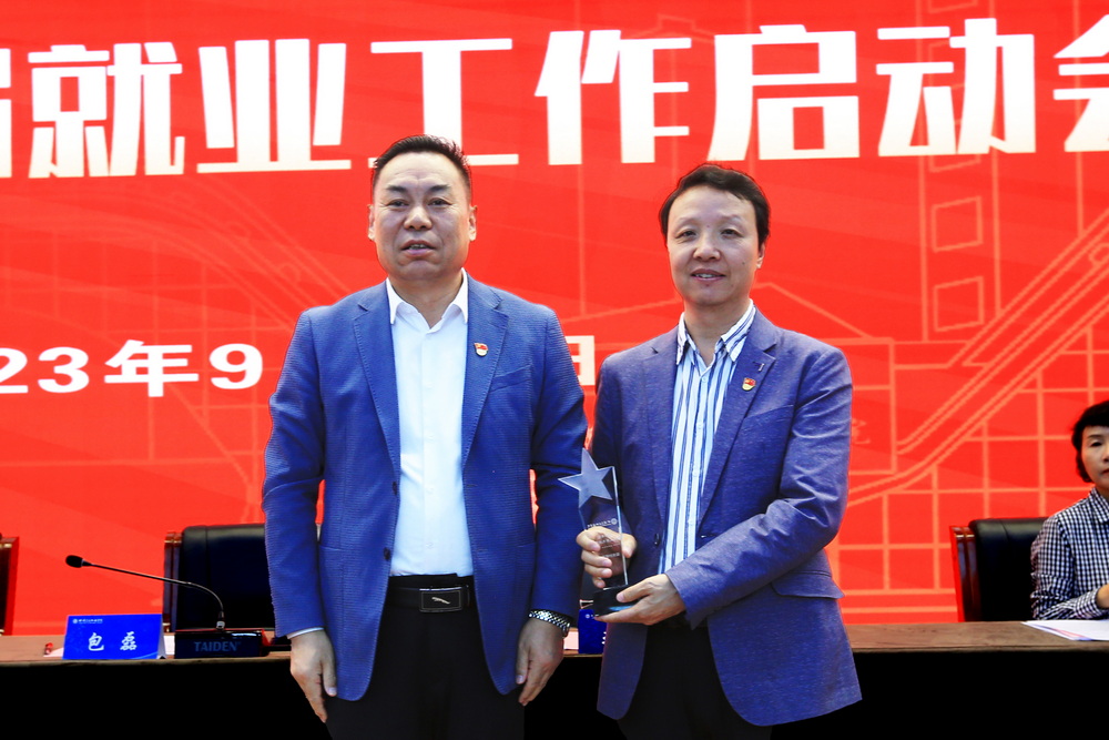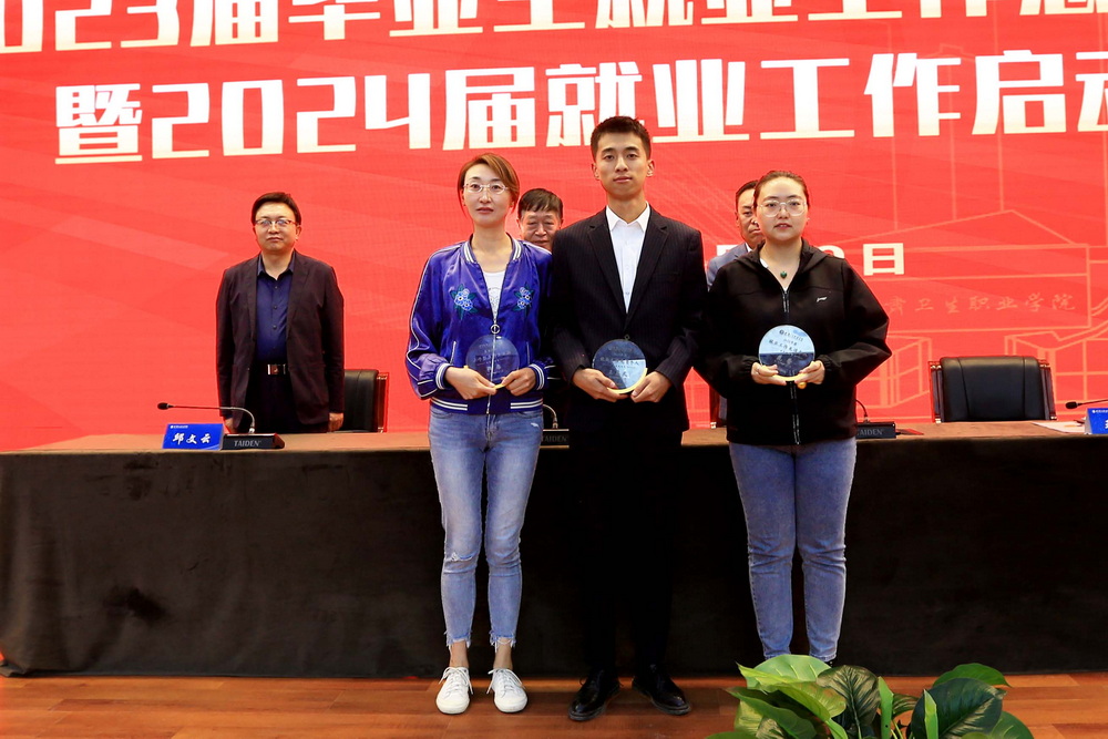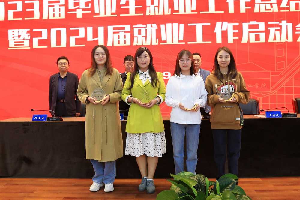 会议对2023届毕业生就业工作成绩突出的先进集体和先进个人进行表彰。高博副校长宣读《关于表彰就业工作先进集体和先进个人的决定》,校领导为获得荣誉的集体及个人颁发了奖杯。