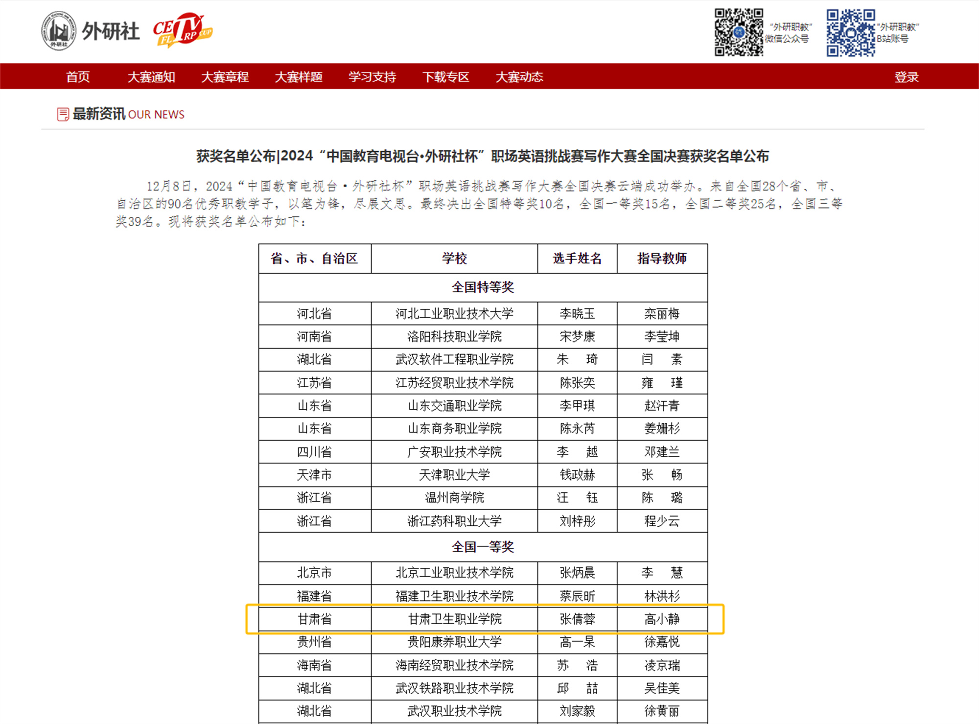 由中国职业技术教育学会指导,中国教育电视台、外语教学与研究出版社联合主办的2024“中国教育电视台·外研社杯”职场英语挑战赛写作大赛和演讲大赛全国决赛在12月8日、12日成功举办。我校学生张倩蓉获得写作大赛全国一等奖,苏燕妮获得演讲大赛全国三等奖。高小静和钱磊分别获得指导教师一等奖和三等奖。