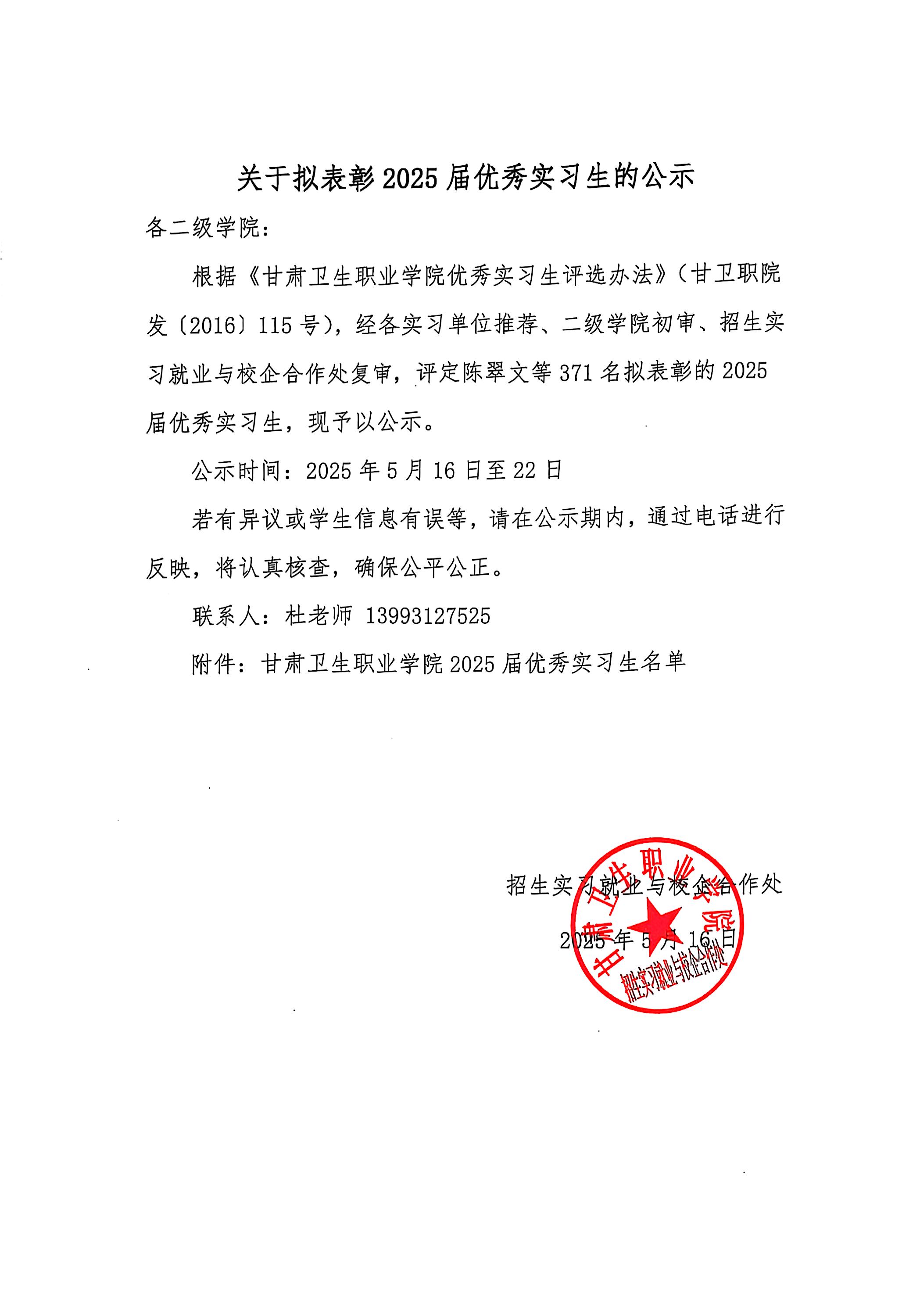 附件:甘肃卫生职业学院2025届优秀实习生名单