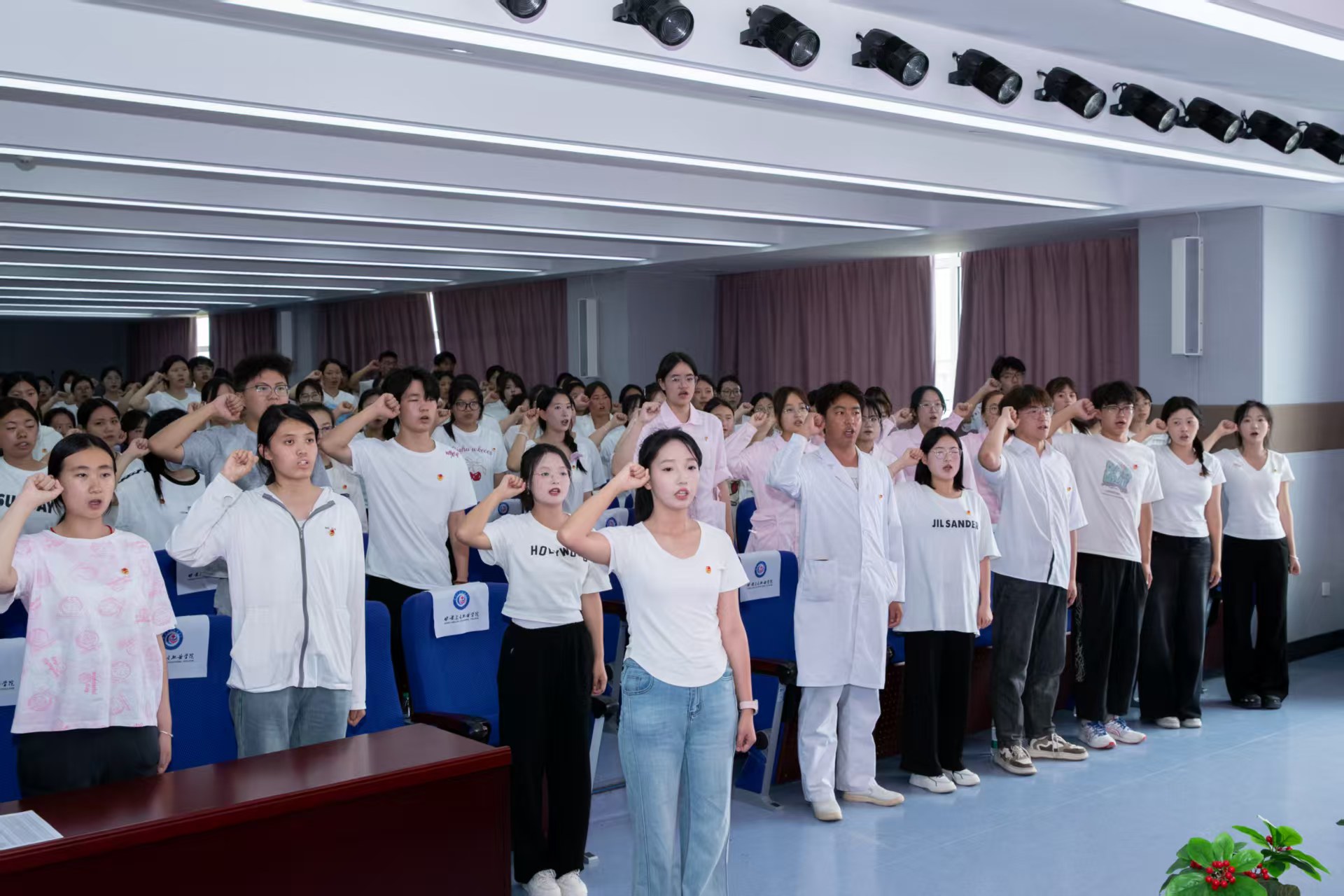 在学生书记张紫雯的领誓下,全体新团员面向团旗,高举右拳庄严宣誓,铿锵誓言彰显着对共青团的忠诚。新团员代表马雪蕊发言,表达了传承五四精神、矢志奋斗的决心。最后马彦军强调,全体团员需时刻牢记身份,将“请党放心,强国有我”的誓言转化为服务人民健康的实际行动。