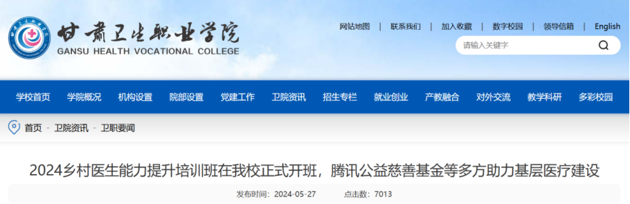 5月27日上午,由国家卫生健康委能力建设和继续教育中心、中国人口福利基金会以及腾讯公益慈善基金会共同主办,甘肃省卫生健康委员会、甘肃卫生职业学院协办的2024年度乡村医生能力提升培训项目开班仪式在甘肃卫生职业学院学术报告厅隆重召开。中国人口福利基金会国内项目部部长李爽、甘肃省卫生健康委员会基层卫生健康处处长张军莉、腾讯公益慈善基金会可持续社会价值智库高级经理王斌出席开班式,348名来自全省各地的乡村医生培训学员参加开班式。学校党委书记包磊代表学校致辞,开班式由学校党委委员、副校长张军荣主持。