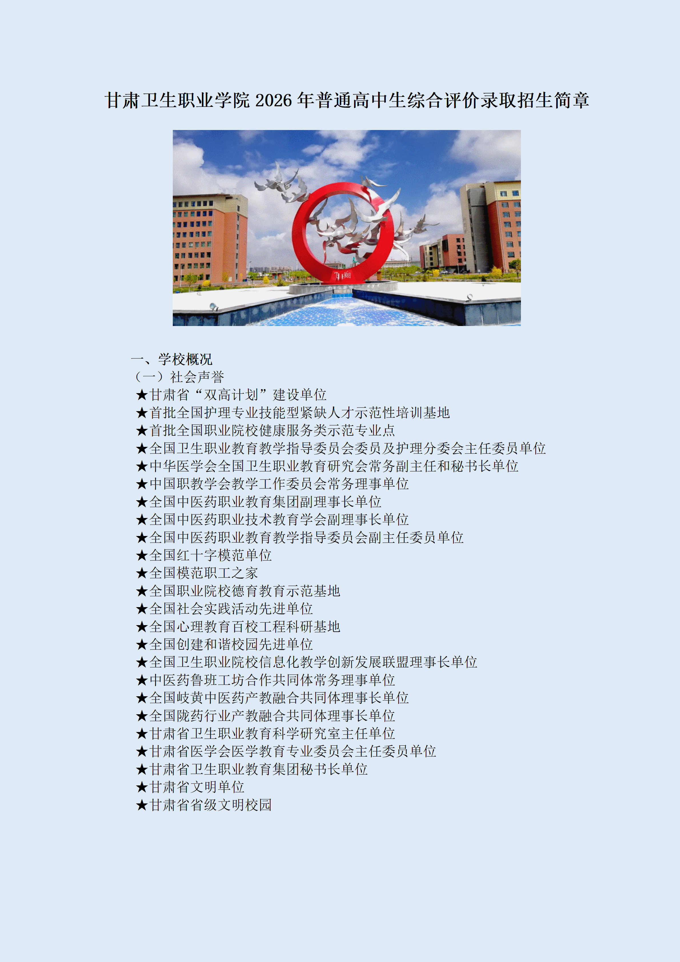 甘肃卫生职业学院2026年普通高中生综合评价录取招生简章