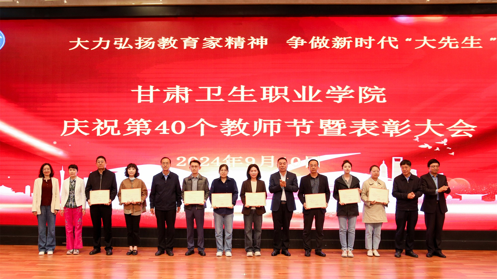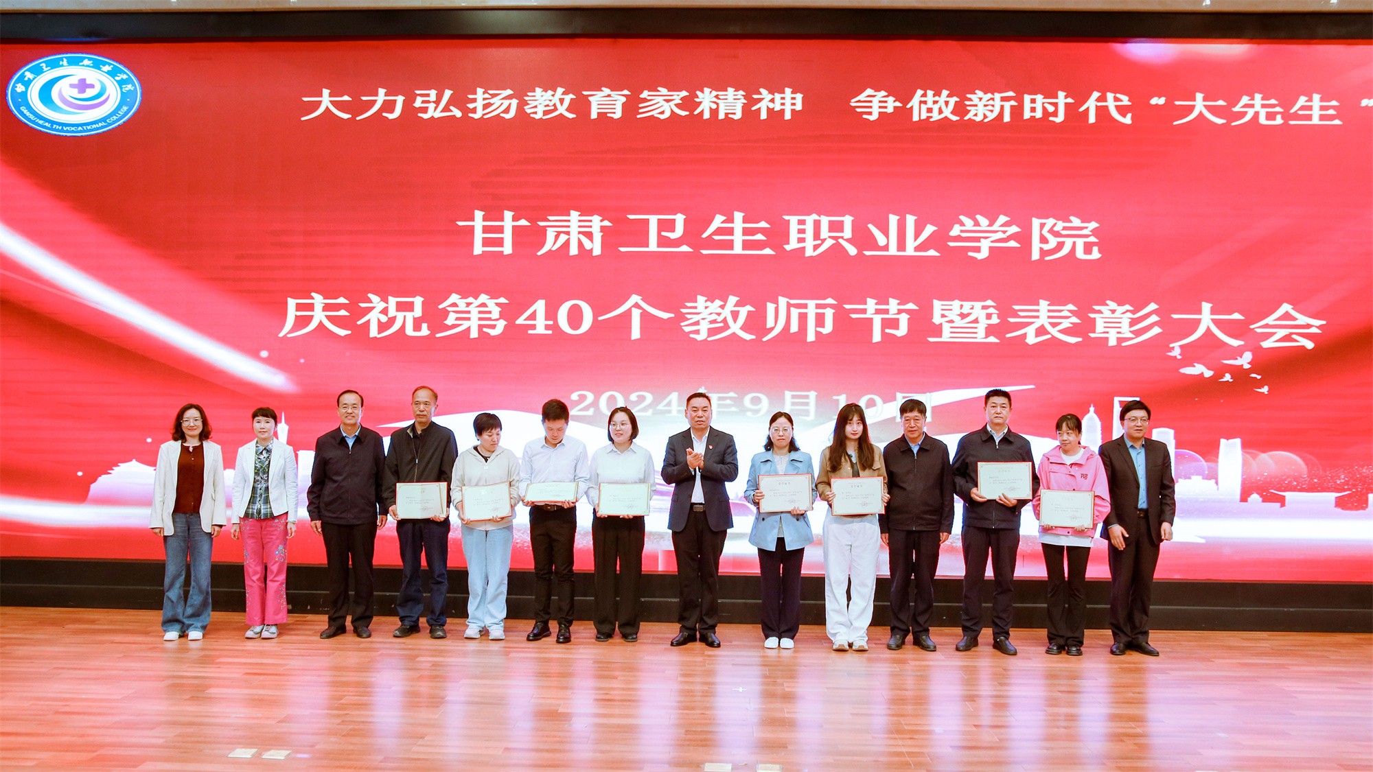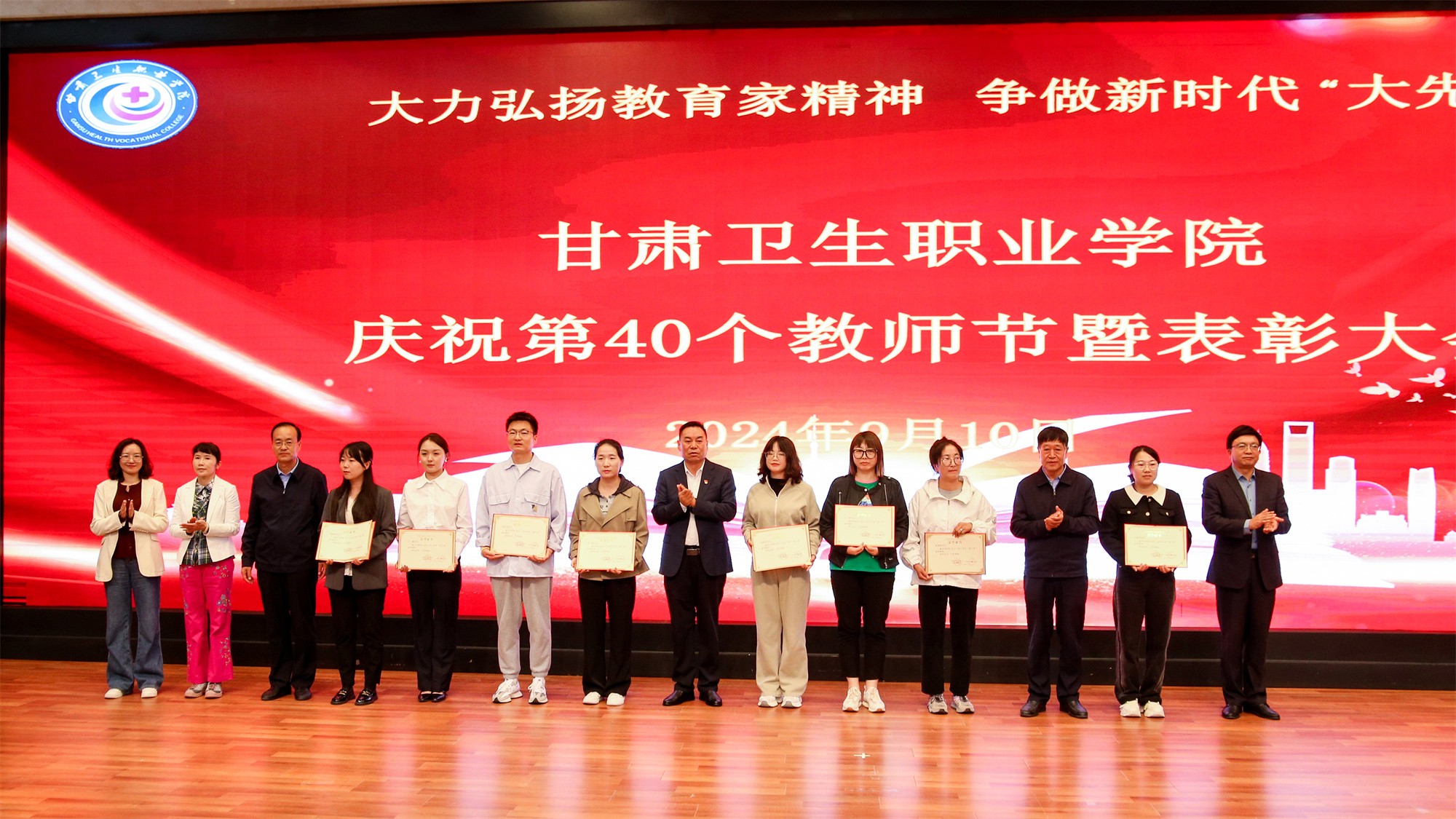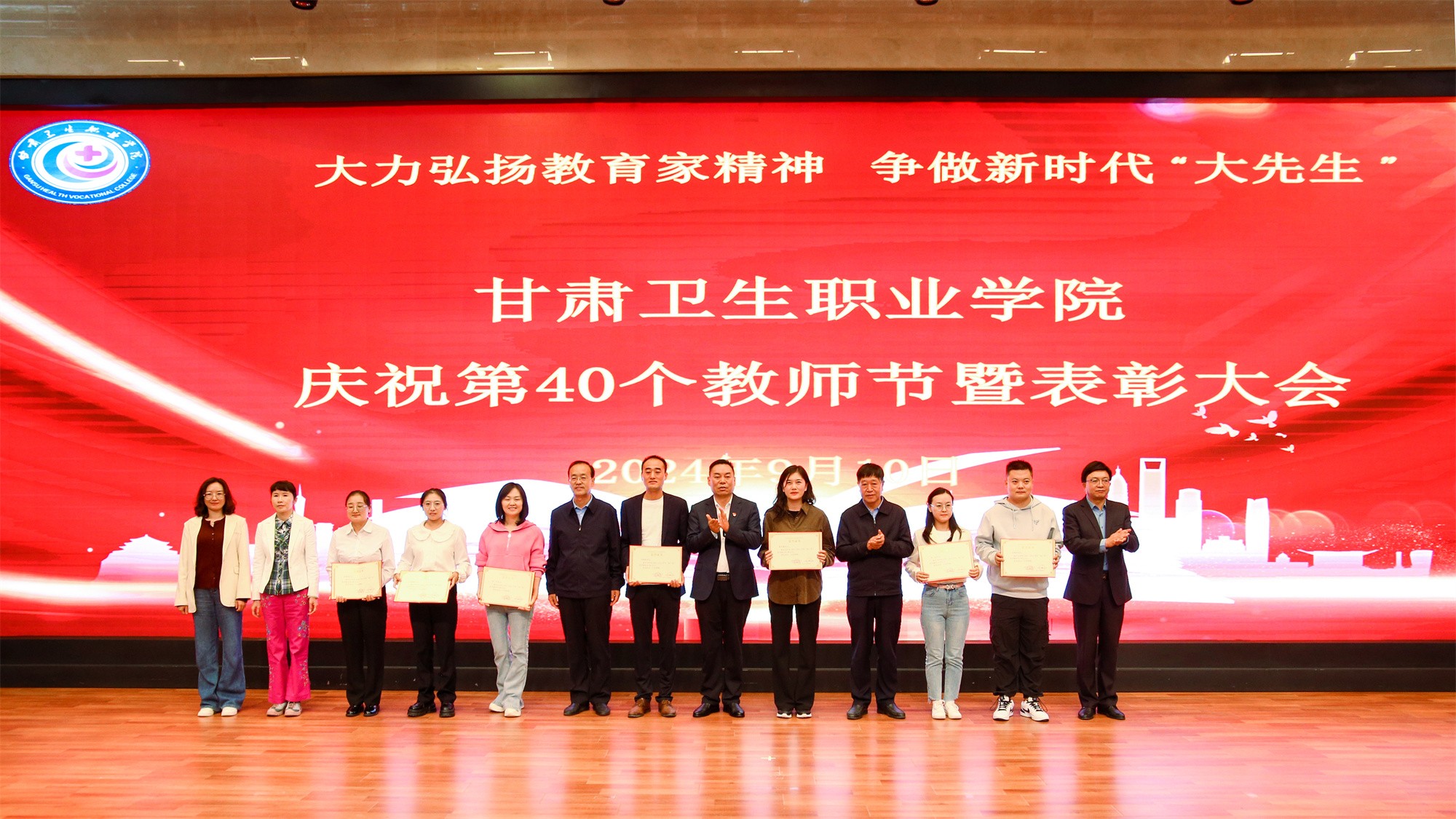 为庆祝第40个教师节,激发教师奋进热情、弘扬尊师风尚,9月10日下午,我校在1号教学楼学术报告厅隆重召开甘肃卫生职业学院庆祝第40个教师节暨表彰大会,在家校领导、副处级干部出席会议,全体中层干部、无课教师及学生代表参加大会。会议由党委副书记毕效武主持。