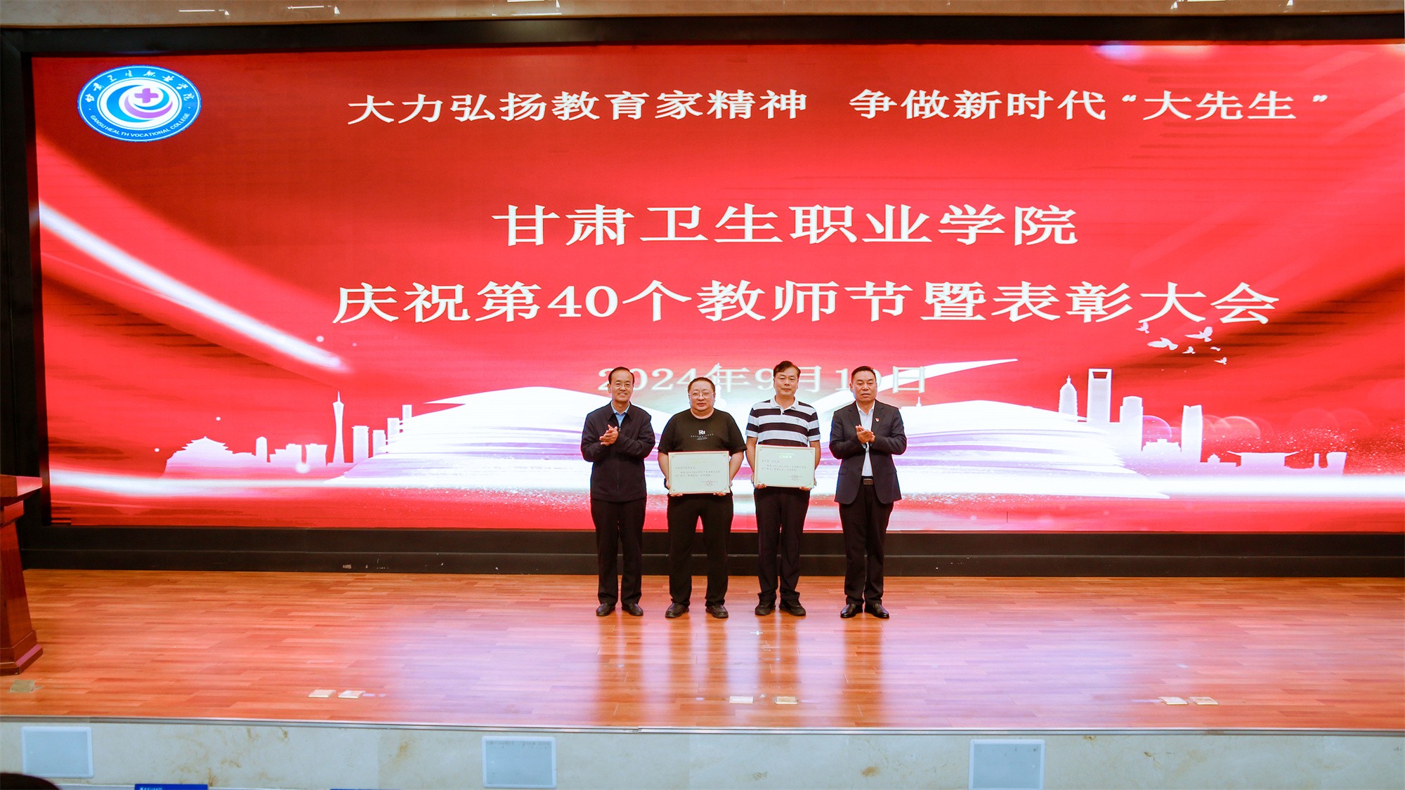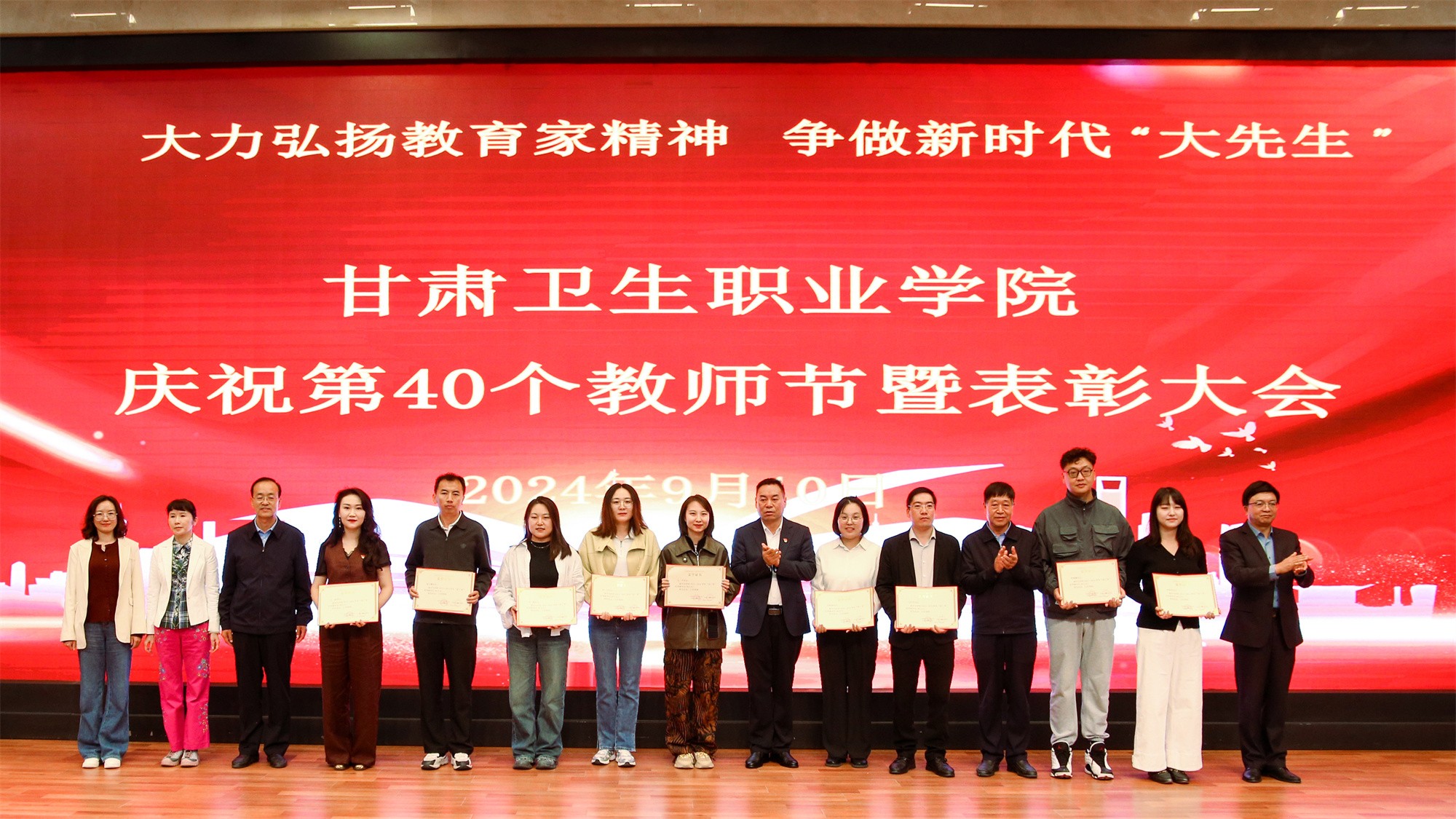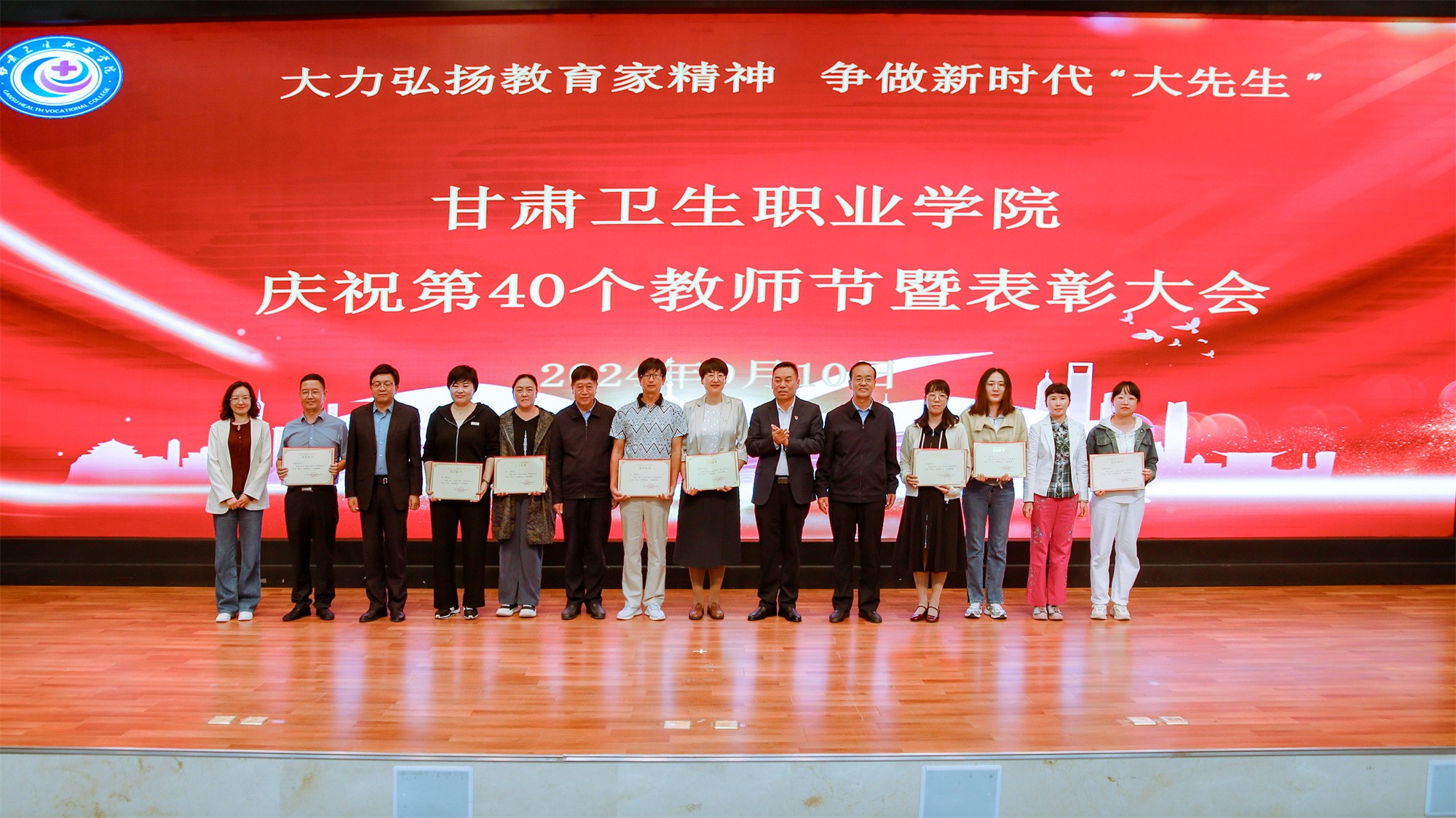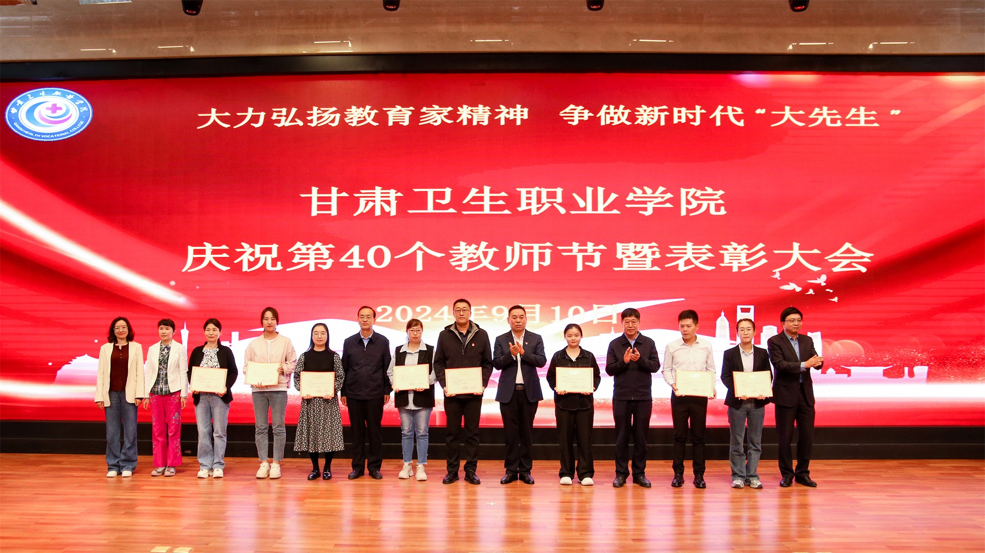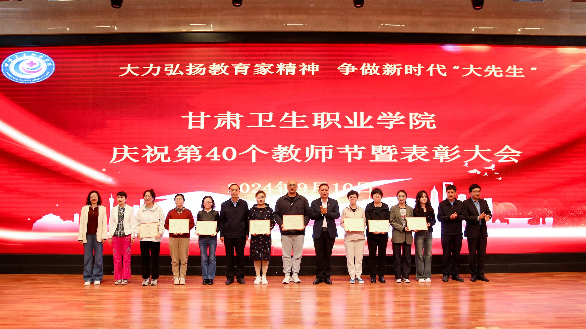为庆祝第40个教师节,激发教师奋进热情、弘扬尊师风尚,9月10日下午,我校在1号教学楼学术报告厅隆重召开甘肃卫生职业学院庆祝第40个教师节暨表彰大会,在家校领导、副处级干部出席会议,全体中层干部、无课教师及学生代表参加大会。会议由党委副书记毕效武主持。
