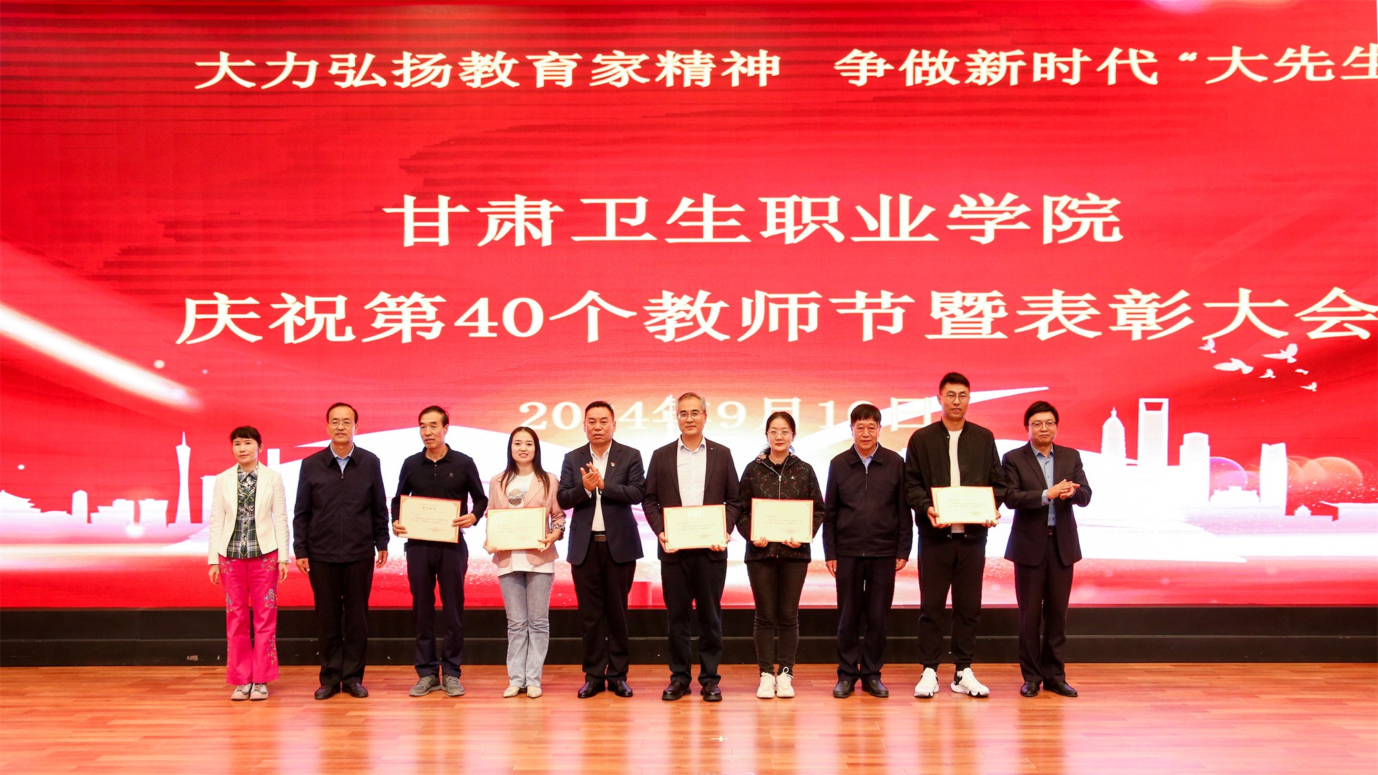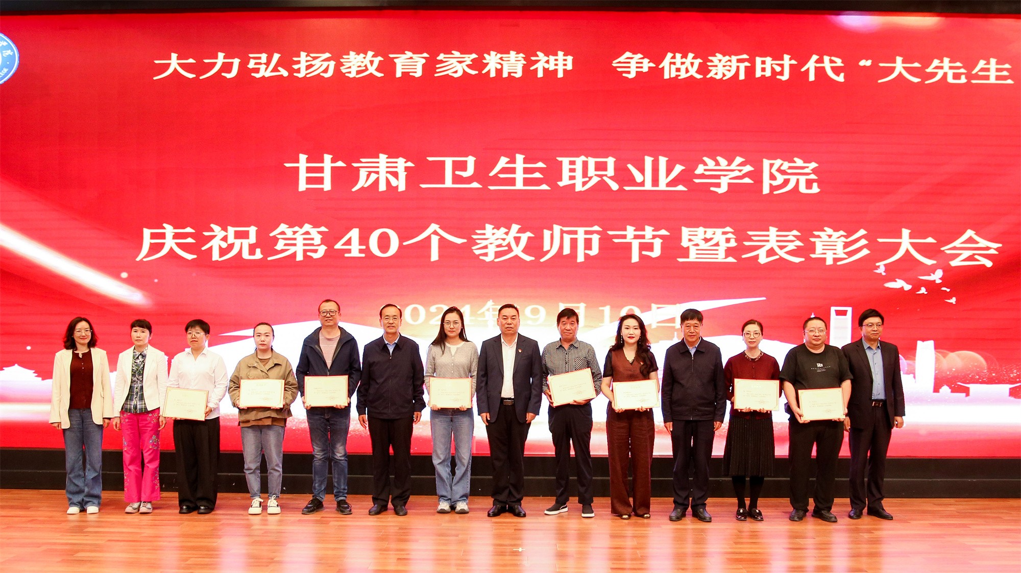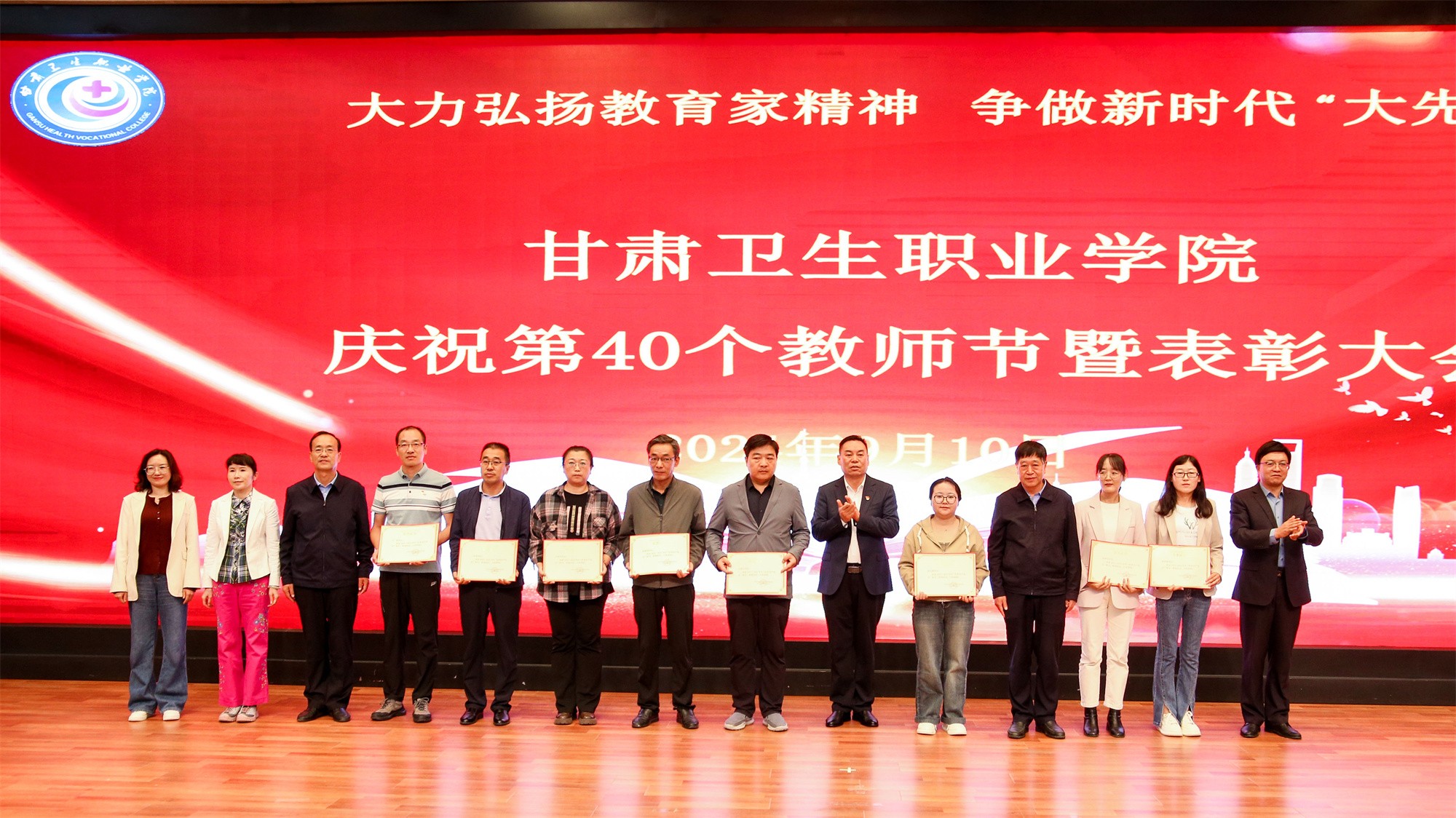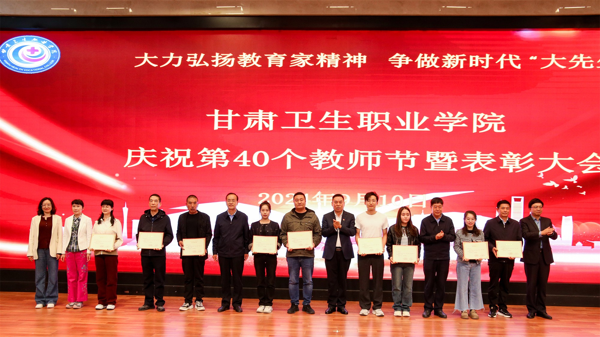 庆祝大会在热烈的掌声中圆满结束,全体教师度过了一个富有成就感、荣誉感、幸福感的节日。在校党委的正确领导下,全校师生员工将团结一心,凝心聚力,永葆生机,接续奋斗,努力为建设英姿勃发的、富有特色的甘肃卫生职业学院而努力奋斗。