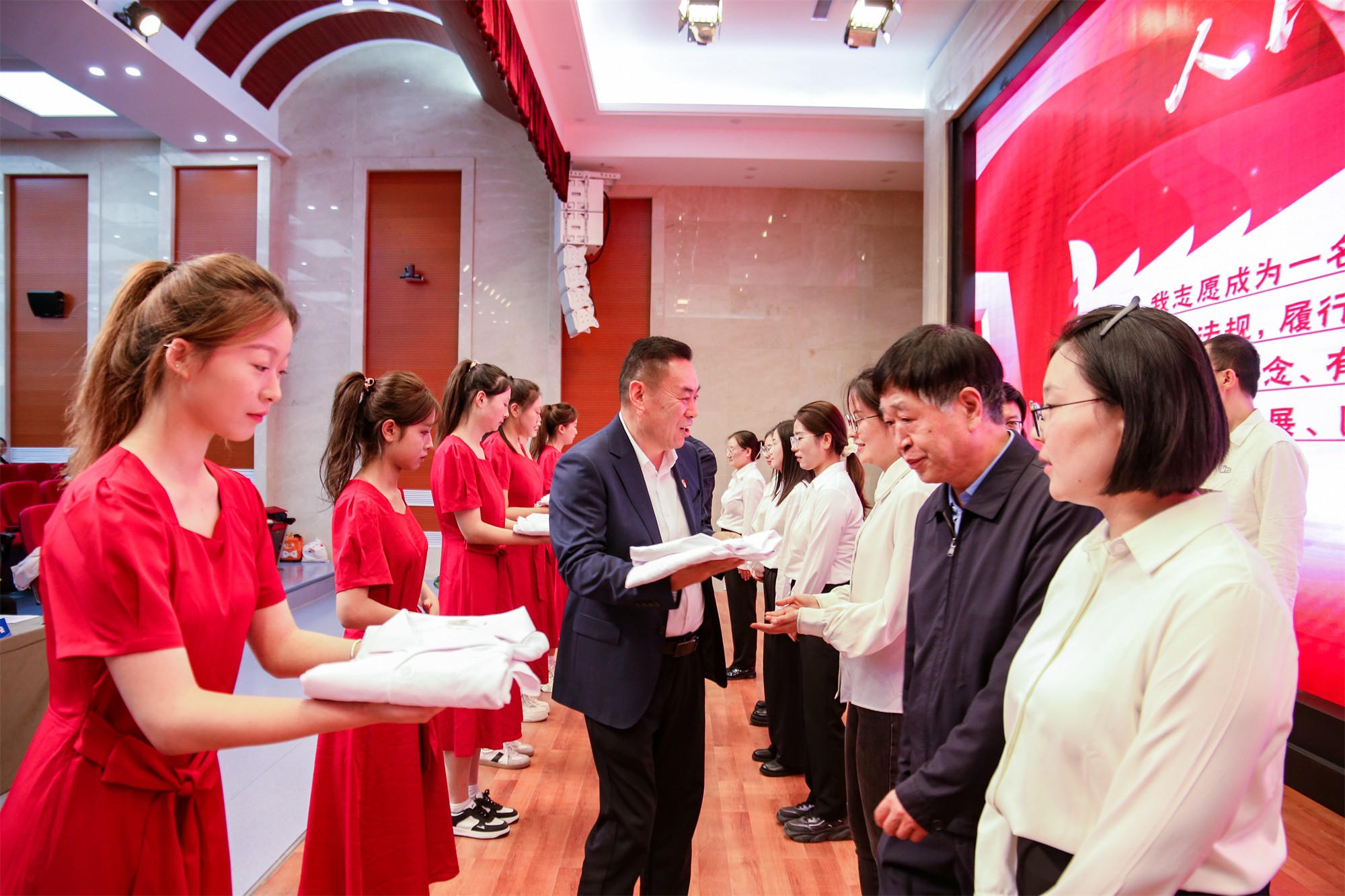 大会举行了新教师入职宣誓仪式,17名新入职教师在庄重而温馨的氛围中依次上台,临床医学院院长寇桂香教授作为老教师代表为新教师领誓,与会校领导为新入职教师授校徽和工作服。现场响起热烈的掌声,欢迎新同事加入卫职院大家庭,共同投入到学校建设发展的光荣事业中。