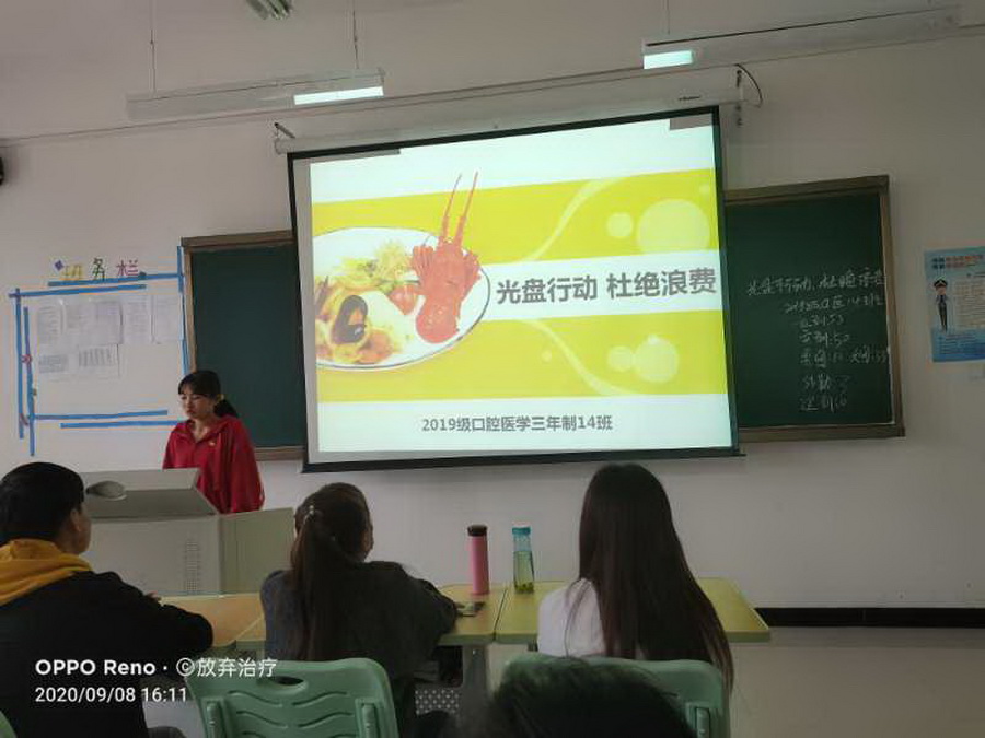 为深入贯彻落实习近平总书记关于“坚决制止餐饮浪费行为,切实培养节约习惯”的重要指示精神,引导广大团员青年杜绝浪费粮食,养成节约习惯,传承中华美德,营造“浪费可耻、节约光荣”的良好氛围,9月8日下午,校团委组织在校班级团支部以及学生社团全体团员开展了“制止餐饮浪费,倡导节约用餐”的团日活动。活动由各团支部书记和社团负责人主持。活动中,由学生代表宣读我校制止餐饮浪费、倡导节俭用餐倡议书,倡议全体学生:厉行节约,争做爱粮节粮的倡导者;理性消费,争做爱粮节粮的践行者;率先垂范,争做爱粮节粮的宣传者。坚决制止餐饮浪费行为,切实培养节约习惯,用实际行动为国家、为社会、为学校、为家庭奉献力量。