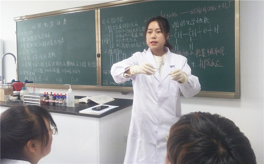 此次公开教学内容为《有机化学实验——醇的性质》,授课过程中,张莉老师对实验原理进行了详细讲解,规范演示了金属钠与乙醇的反应,让学生认真观察现象,通过触摸试管外壁是否发热验证实验原理。学生通过观察、感触等方式,加深了对醇的性质的理解,也感受到了化学实验的奇妙之处。