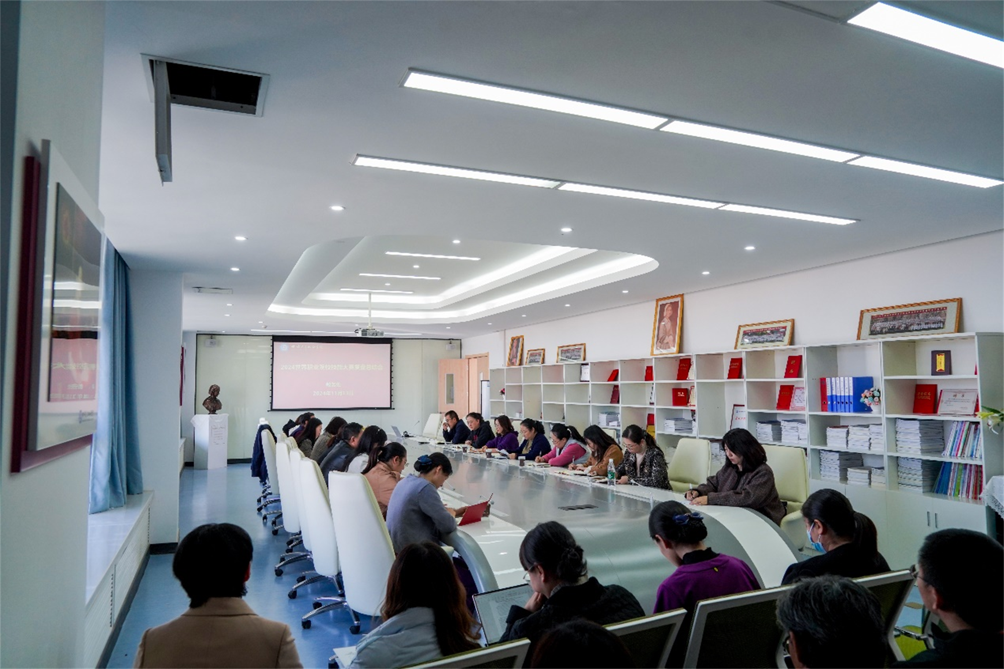 杨校长做总结讲话,首先她代表学校对所有辛勤付出的参赛团队表示感谢,对取得优异成绩的参赛团队表示热烈祝贺,她指出,反思世赛的过程和结果比世赛成绩更为重要,世赛不仅仅是一次技能的较量,更是对学校综合实力与办学水平的一次全面检验,她强调了四个关键点,一是通过比赛寻找差距,在创新性和岗位胜任力上下功夫,将以赛促教、以赛促学、以赛促练的宗旨要求贯彻到平时的教学活动中;二是转变观念,通过优化校级技能竞赛方案推动教学改革;三是注重学科交叉发展和专业转型,打破固定思维局限,深入研究课程框架;四是发挥学校产教融合共同体的作用,加强产教融合力度。最后,教务处对下一步校级技能竞赛的工作进行了部署安排。