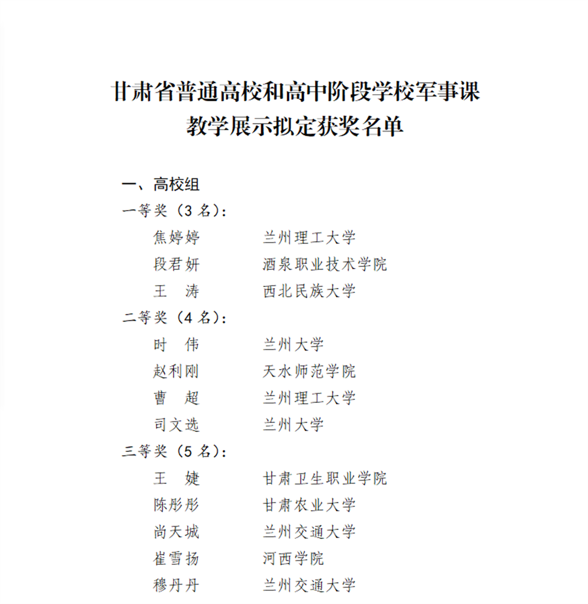 11月2日,由省教育厅主办、兰州理工大学承办的首届甘肃省普通高校和高中阶段学校军事课教学展示活动在兰州理工大学举办。全省共计78名军事课专兼职教师参加比赛,我校王婕老师在决赛中表现优异,荣获三等奖。