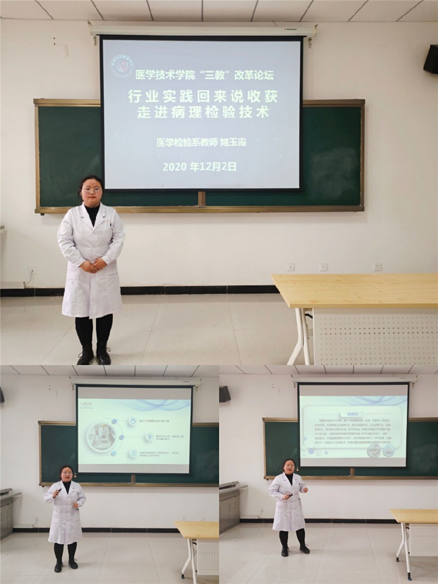 为认真贯彻教育部《职业教育教师实践规范》《国家职业教育改革实施方案》《深化新时代职业教育“双师型”教师队伍建设改革实施方案》,加快推进《医学技术学院教师赴行业岗位实践学习管理办法》的有效落实,医学技术学院积极安排教师在暑假期间赴行业单位参加专业实践学习活动,提高教师的“双师”能力和水平。12月3日,医学技术学院举行了“三教”改革论坛第三次报告活动,由在暑假期间参加行业实践学习的医学检验教研室教师姚玉霞作了题为《行业实践回来说收获—病理检验技术学习心得》的交流汇报。学院领导、全体专兼职教师、辅导员参加了活动。活动由学院副院长吕荣光主持。