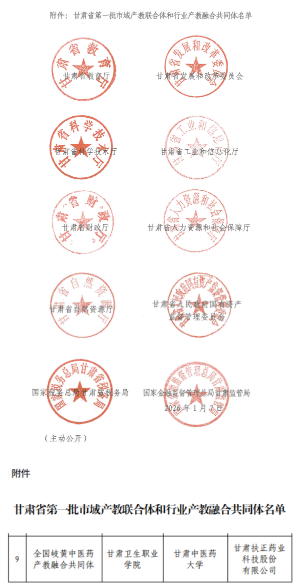 近日,甘肃省教育厅等十部门联合发布《关于公布甘肃省第一批市域产教联合体和行业产教融合共同体名单的通知》(甘教职成函〔2026〕3号),正式公布首批3个市域产教联合体和15个行业产教融合共同体建设名单。其中,由甘肃卫生职业学院牵头,联合甘肃中医药大学、甘肃扶正药业科技股份有限公司共同申报的“全国岐黄中医药产教融合共同体”成功入选,标志着甘肃省在中医药领域产教融合与协同育人方面迈出重要一步。