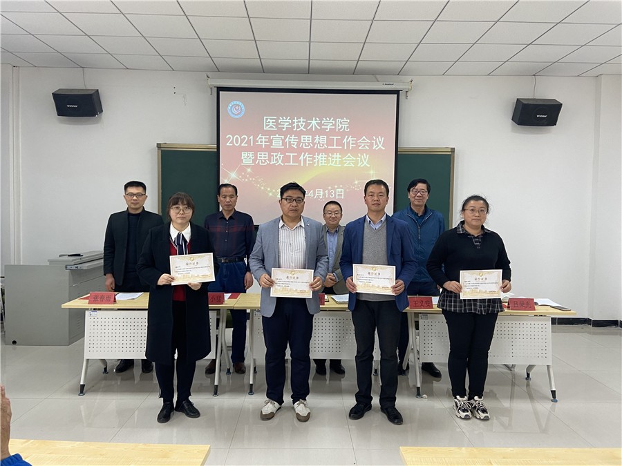 王义安传达了3月30日学校宣传部组织召开的“专项工作暨落实《教育部等八部门关于加快构建高校思想政治工作体系意见》工作推进会”精神,进一步组织与会人员学习了文件内容,对本年度学院的思政工作作了部署安排;副院长、学院宣传领导小组工作办公室主任张春雨作了学院2020年宣传思想工作报告,他全面总结了学院2020年宣传思想工作,分析了存在的问题和困难,从八个方面部署了今年的工作;副院长吕荣光宣读了《医学技术学院关于表彰2020年度优秀通讯员、优秀新闻稿作者和公布学院2020年十大新闻的通知》,并对优秀通讯员、优秀新闻稿作者和2020年十大新闻的评选目的、评选标准和评选过程作了介绍。会议为获奖教师颁发了奖状。