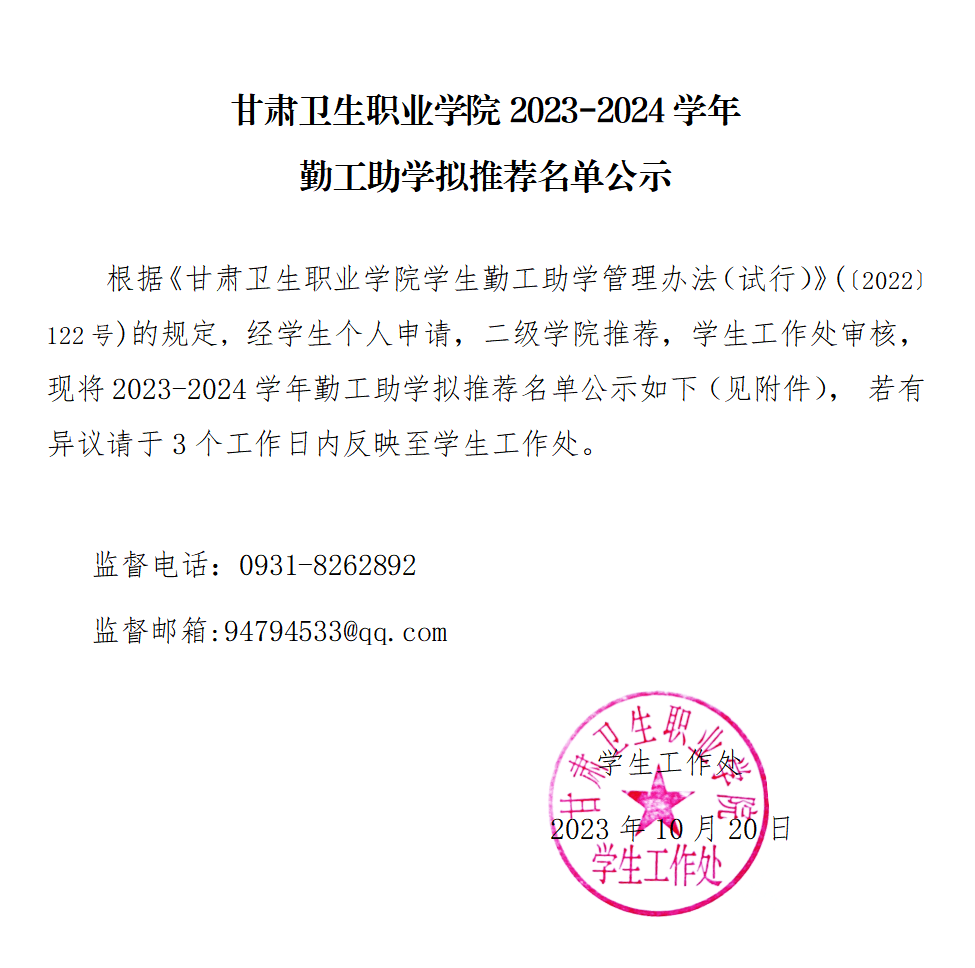 甘肃卫生职业学院2023-2024学年勤工助学拟推荐名单公示发布时间:2023-10-20 -