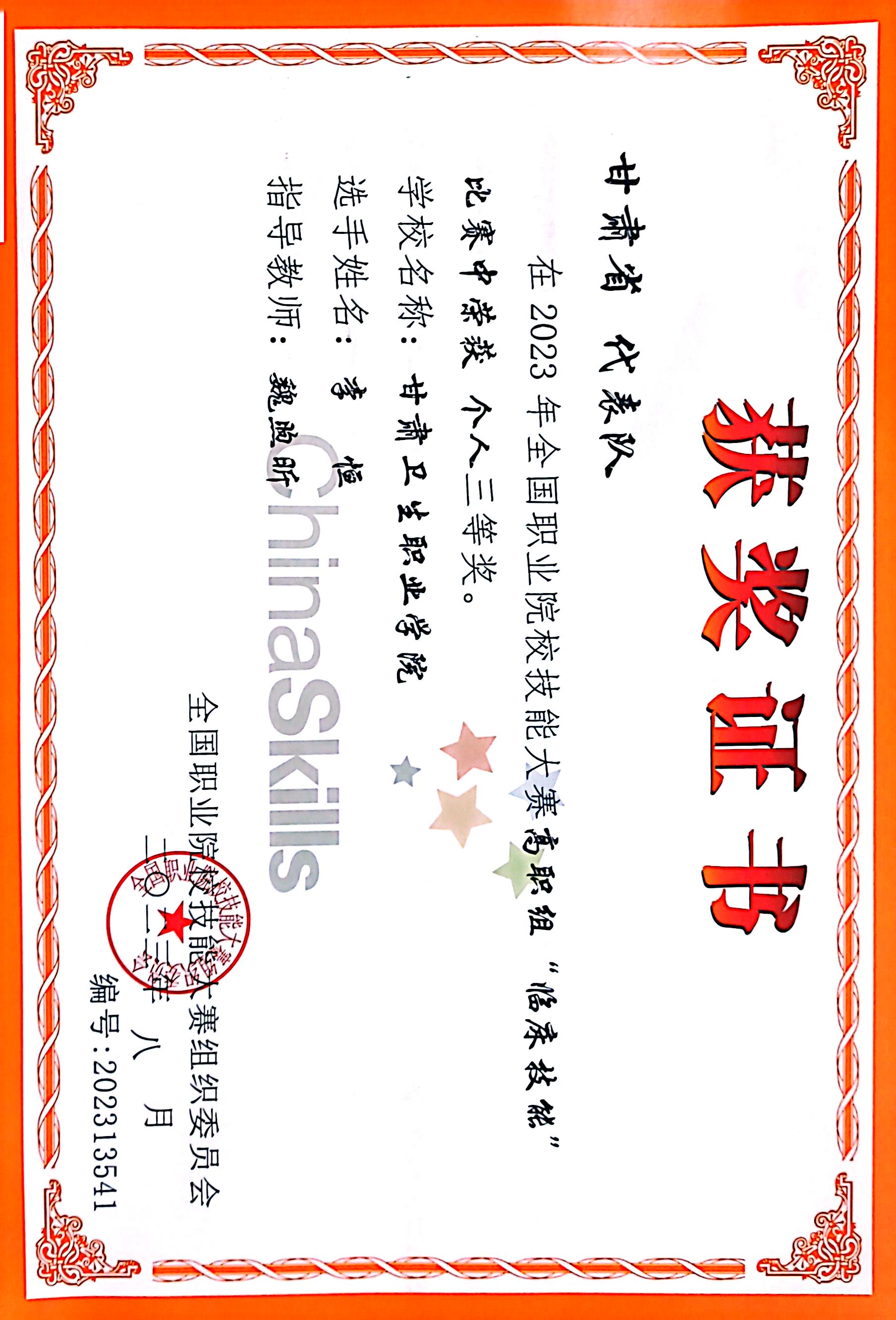 全国临床技能竞赛一等奖第三名