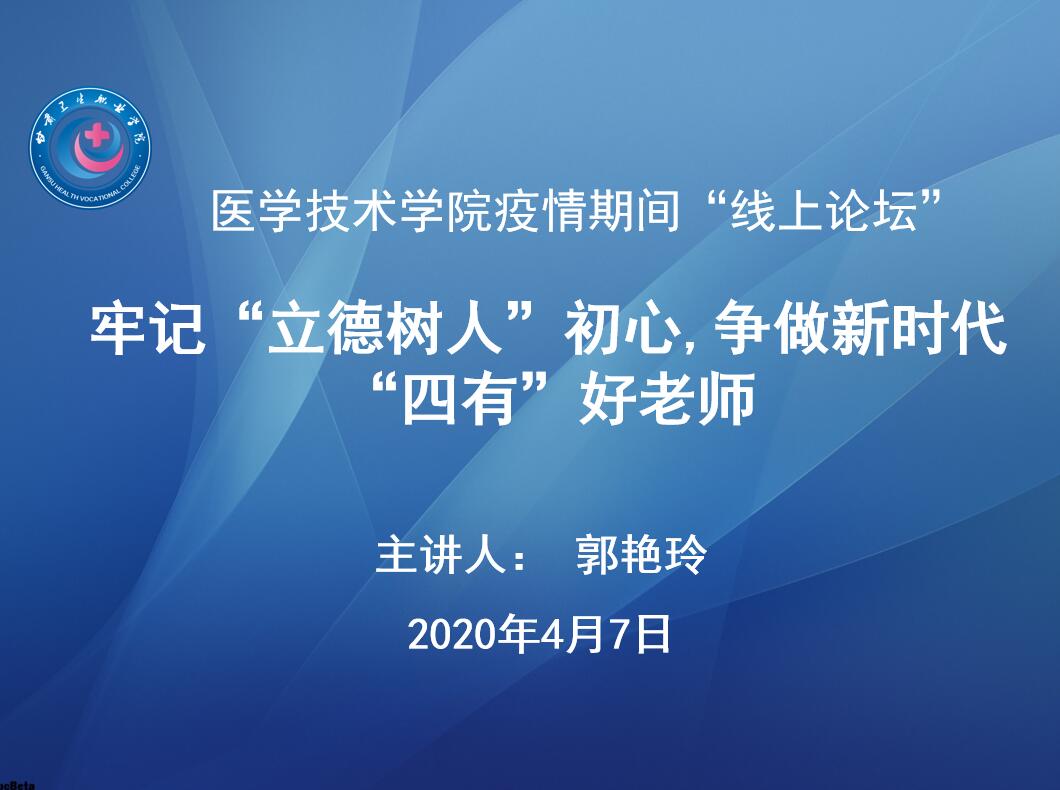 牢记“立德树人”初心,争做新时代“四有”好老师——医学技术学院举办疫情期间“线上论坛”第五讲发布时间:2020-04-08 -
